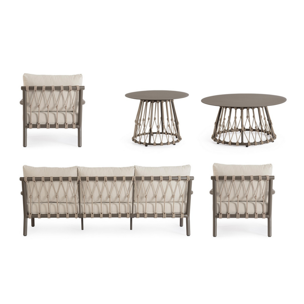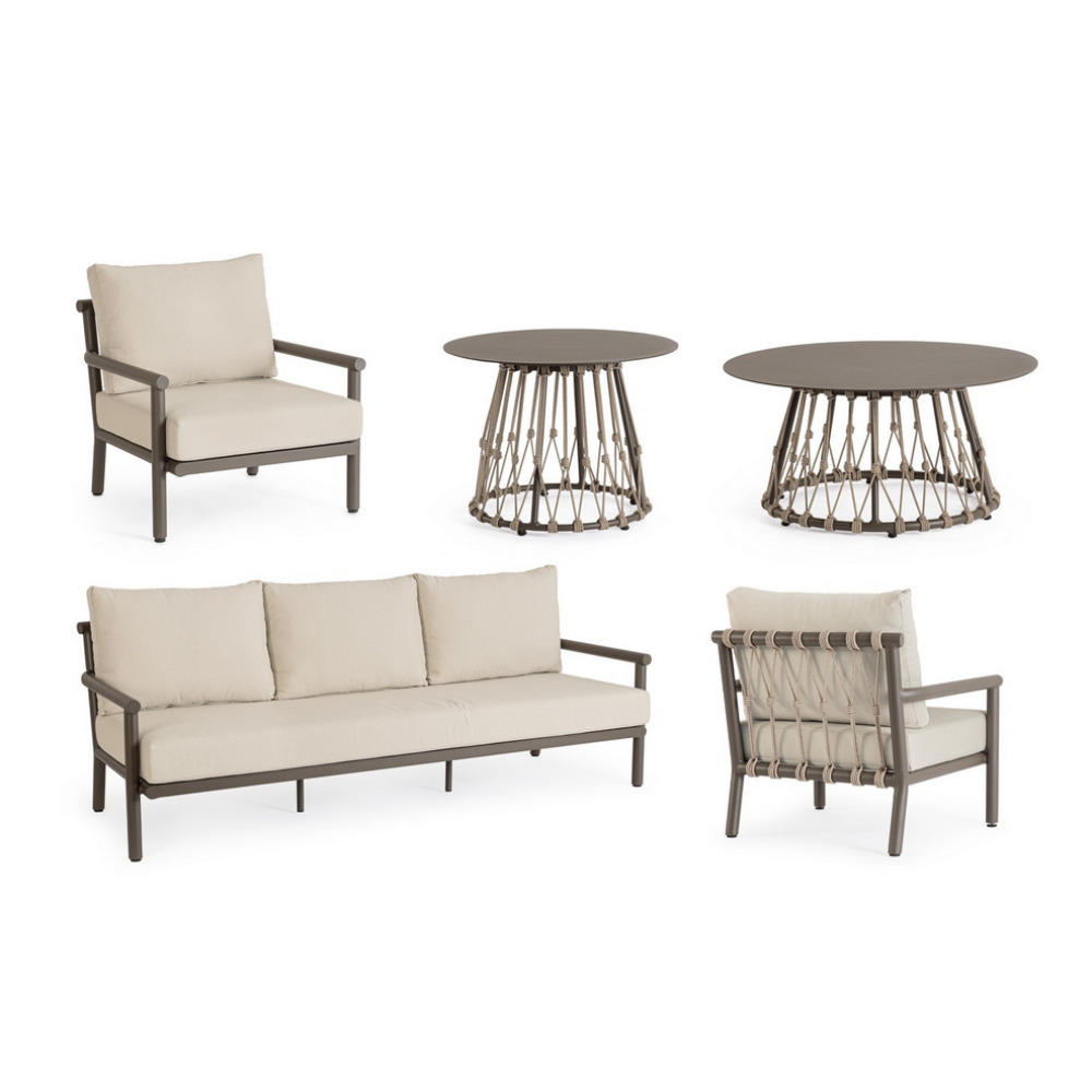 Комплект меблів Bizzotto LANAI — це інтелектуальне та емоційно переконливе інвестиційне рішення для створення ідеальної зони відпочинку. Його цілісна композиція з дивана, двох крісел та круглих столиків з декоративним плетінням, реалізована через надсучасні матеріали (алюміній, олефін, поліестерні канати),