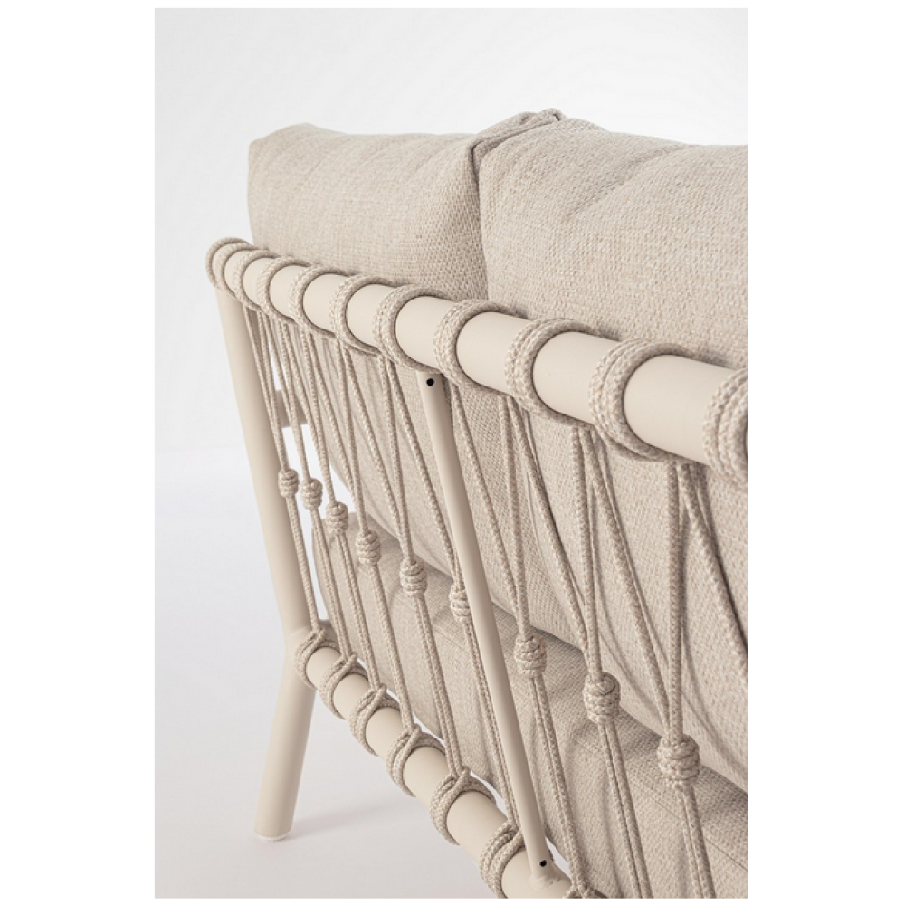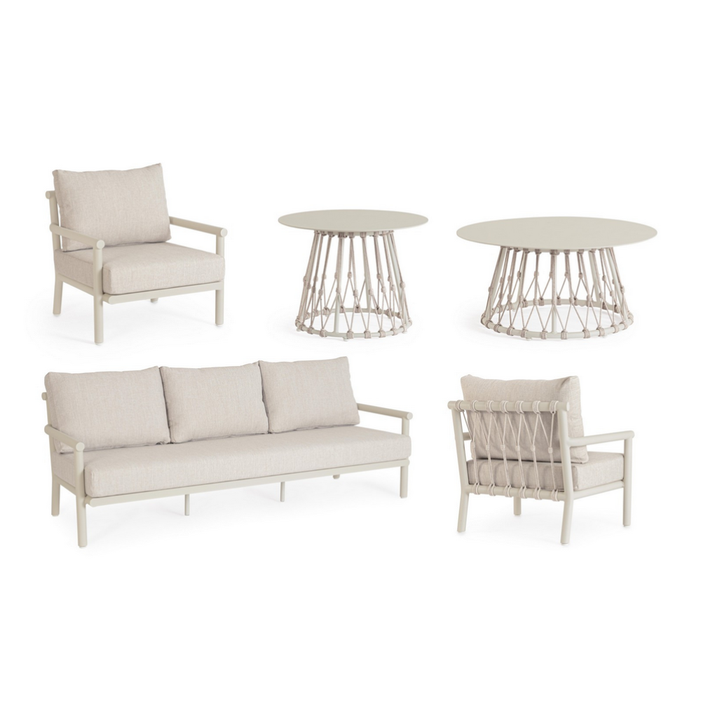 Комплект меблів Bizzotto LANAI — це інтелектуальне та емоційно переконливе інвестиційне рішення для створення ідеальної зони відпочинку. Його цілісна композиція з дивана, двох крісел та круглих столиків з декоративним плетінням, реалізована через надсучасні матеріали (алюміній, олефін, поліестерні канати),