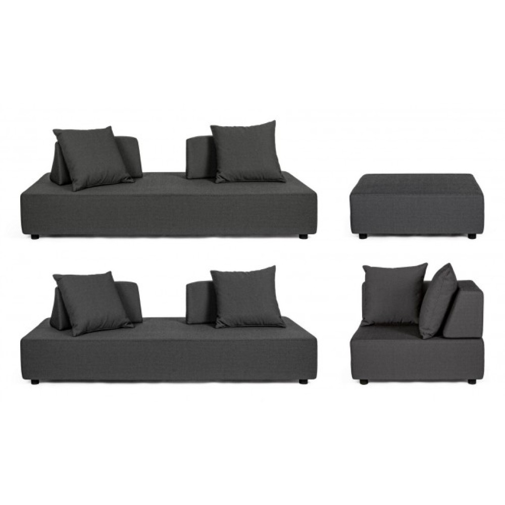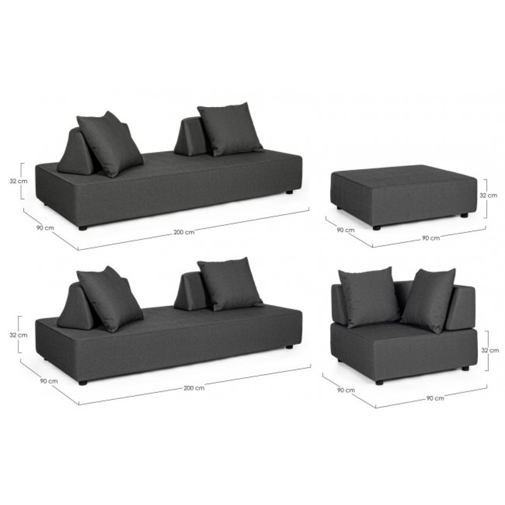 ДИВАНИ ТА ТАХТА З АЛЮМІНІЄВИМ КАРАКОМ. ЗНІМНІ СПИНКИ ЗІ СТАЛЕВИМ КАРАМОМ, ГАРЯЧИМ ОЦИНКУВАННЯМ ТА ПОРОШКОВИМ ПОКРИВАННЯМ (ПОЛІЕСТЕР). СИДІННЯ, СПИНКА ТА ПОДУШКИ ЗІ ЗНІМНИМ ЧОХЛОМ ДЛЯ ЗОВНІШНЬОГО ПОКРИТТЯ З ОЛЕФІНОВОЇ ТКАНИНИ (100% ПОЛІПРОПІЛЕНУ, 285 Г/М2), ВОДООТШЛІКУВАЛЬНОГО ТА УФ-СТІЙКОГО (7 КЛАСУ), ВНУТРІШНЬОГО ВОДОІЗОЛЬКОВОГО ТКАНИННОГО ПОКРИТТЯ (ПОЛІУРЕТАН). ПІНОПОЛІУРЕТАНОВА ПРОКЛАДКА ДЛЯ СИДІННЯ (38КГ/М3), ДЛЯ СПИНКИ (20КГ/М3). ПРЕДМЕТ СКЛАДАЄТЬСЯ З: N°2 ДИВАНІ, N°1 КУТОВИЙ ДИВАН, N°1 ТАХТА, N°4 СПИНКИ НАПІВМІСЯЦЯ, N°1 КУТОВИЙ ПІДЛІКТНИК, N°6 ПОДУШКИ. КУТОВИЙ ДИВАН: 90a - 90b - 32h ДИВАН: 200a - 90b - 32h ПУФ: 90a - 90b - 32h СПИНКА НАПІВМІСЯЦЬ: 69a - 36b - 32h КУТОВА СПИНКА: 90a - 90b - 32h