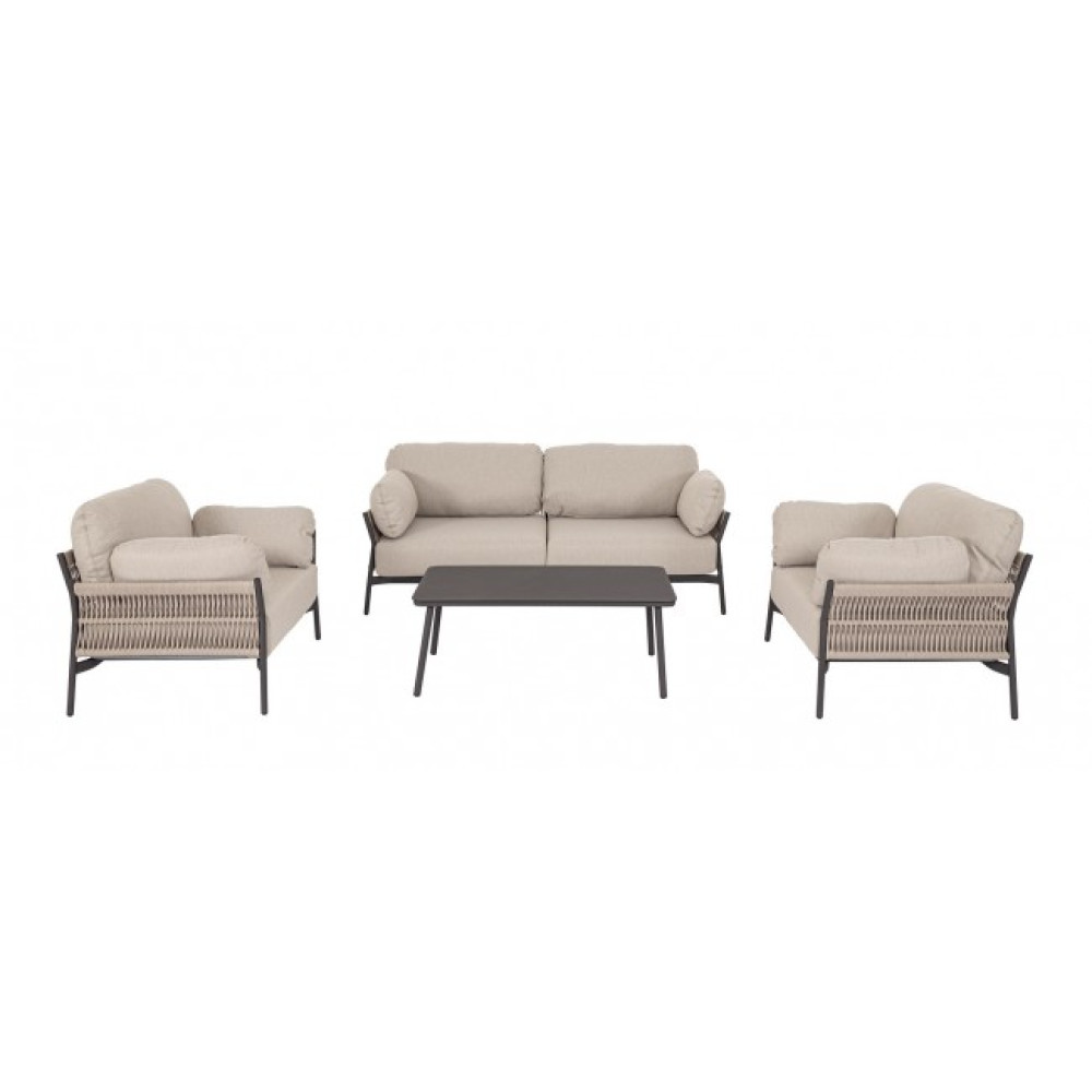 АЛЮМІНІЄВА РАМА ПОРОШКОВО ПОКРИВАНА (ПОЛІЕСТЕР). КАНАТОПЛЕТІННЯ З ОЛЕФІНОВОЇ ТКАНИНИ (100% ПОЛІПРОПІЛЕН). ПОДУШКИ СИДІННЯ ТА СПИНКИ ЗІ ЗНІМНИМ ЧОХЛОМ З ВОДООТШЛІКУВАЛЬНОЇ ОЛЕФІНОВОЇ ТКАНИНИ (100% ПОЛІПРОПІЛЕН).