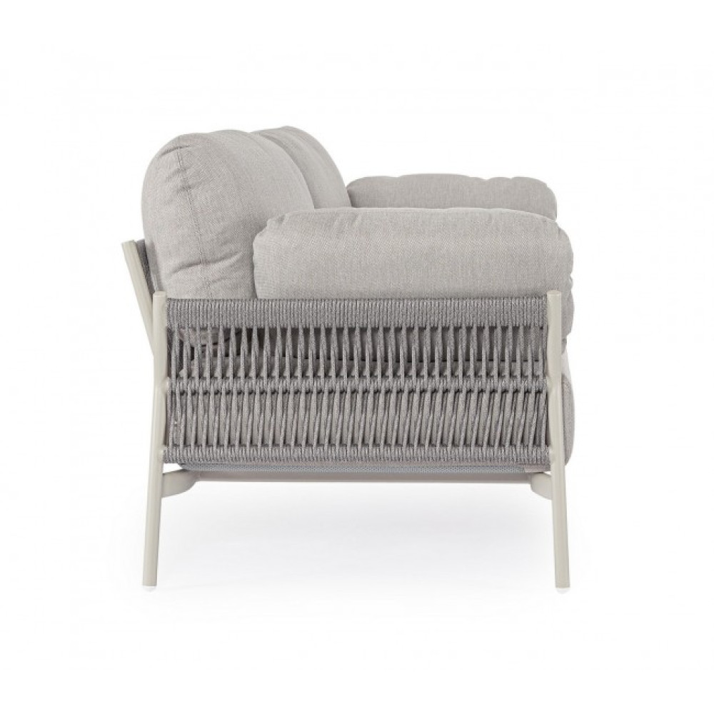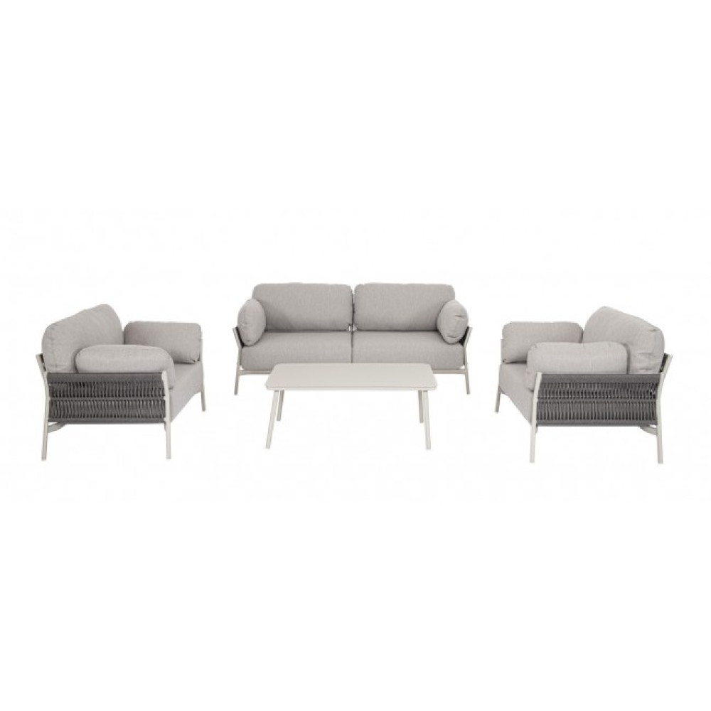 АЛЮМІНІЄВА РАМА ПОРОШКОВО ПОКРИВАНА (ПОЛІЕСТЕР). КАНАТОПЛЕТІННЯ З ОЛЕФІНОВОЇ ТКАНИНИ (100% ПОЛІПРОПІЛЕН). ПОДУШКИ СИДІННЯ ТА СПИНКИ ЗІ ЗНІМНИМ ЧОХЛОМ З ВОДООТШЛІКУВАЛЬНОЇ ОЛЕФІНОВОЇ ТКАНИНИ (100% ПОЛІПРОПІЛЕН).