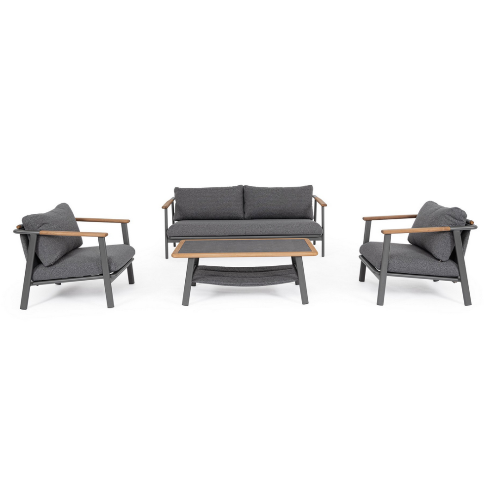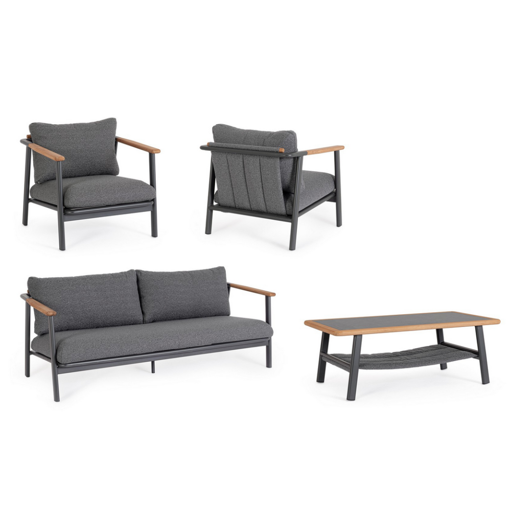 Комплект меблів Bizzotto LEONIDA — це утвердження сили, смаку та майстерності. Його архітектурний каркас з алюмінію, авторитетні вставки з тикового дерева, розкішні подушки з тканини букле та монументальний стіл з імітацією каменю