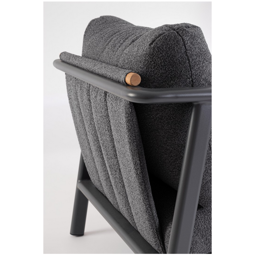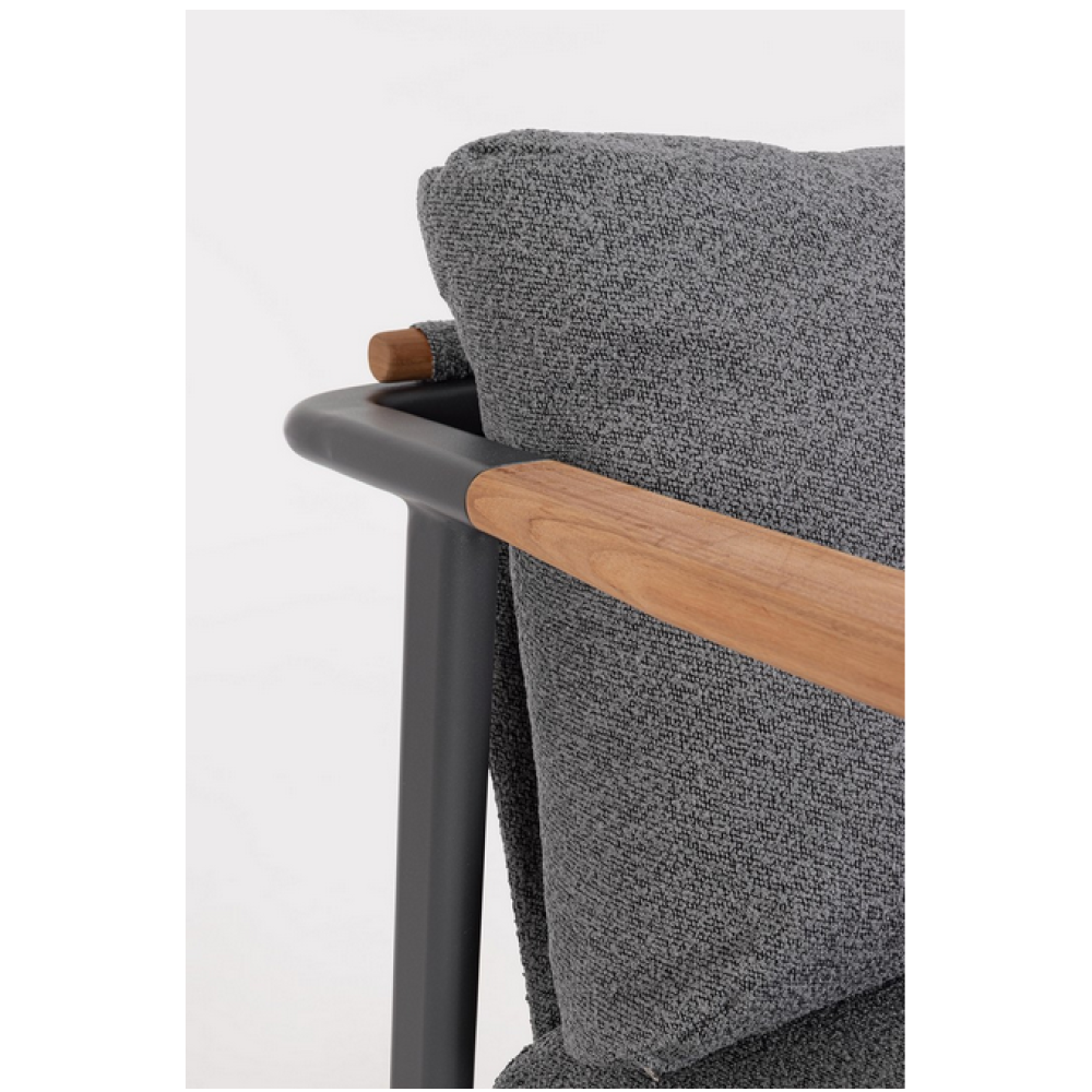 Конструкція з алюмінію із порошковим покриттям (поліестер). Спинка та полиця столика з водовідштовхувальної тканини олефін (100% поліпропілен) з ефектом букле. Підлокітники та спинки із вставками з тикового дерева. Знімні подушки з водовідштовхувальної тканини олефін (100% поліпропілен) з букле ефектом. Кавовий столик (ніжки у зборі) зі скляною стільницею з імітацією натурального каменю.