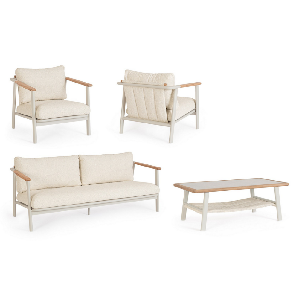 Комплект меблів Bizzotto LEONIDA — це утвердження сили, смаку та майстерності. Його архітектурний каркас з алюмінію, авторитетні вставки з тикового дерева, розкішні подушки з тканини букле та монументальний стіл з імітацією каменю