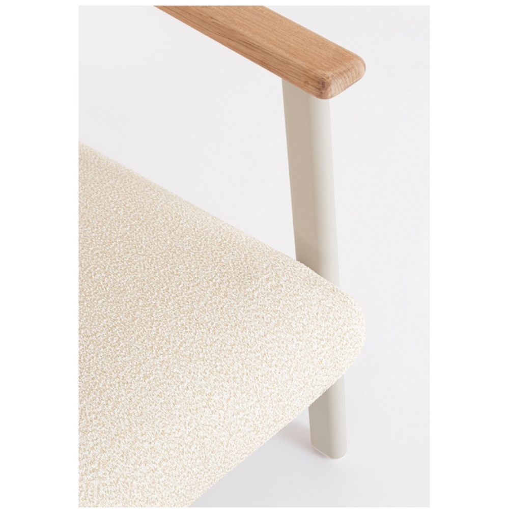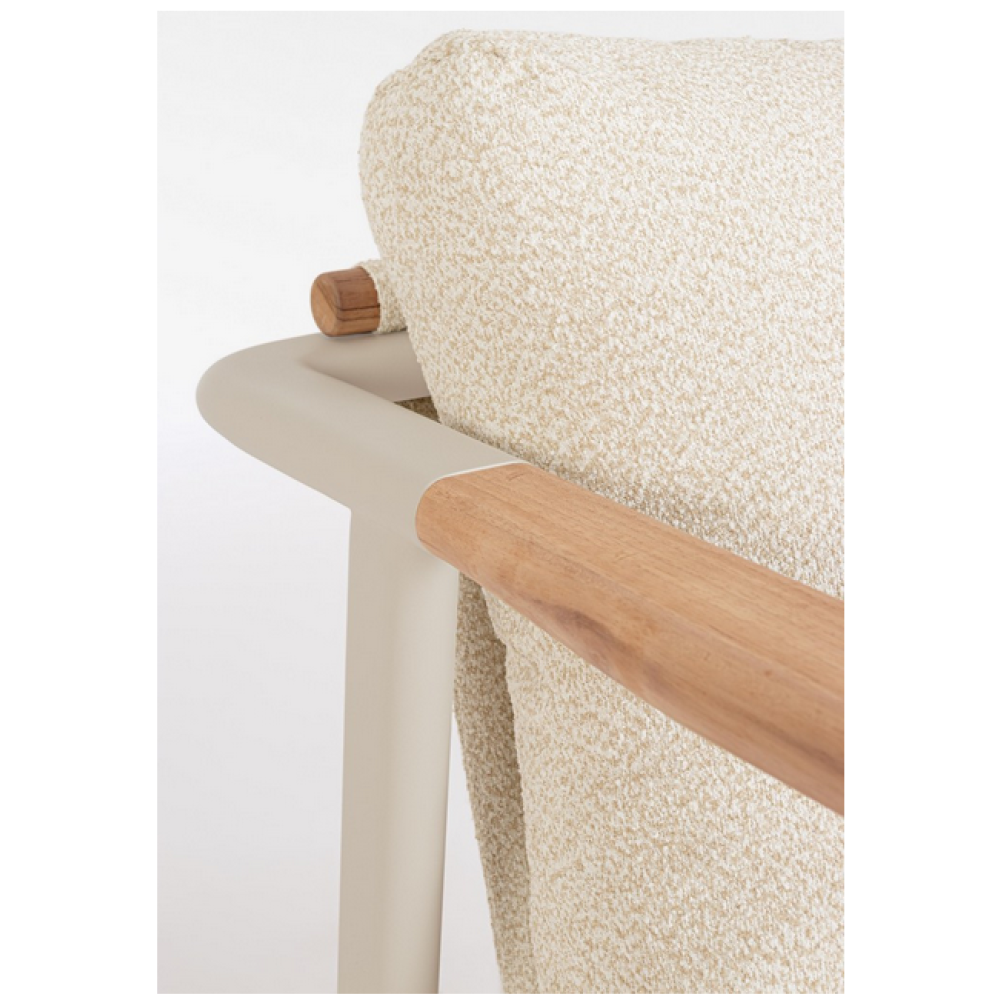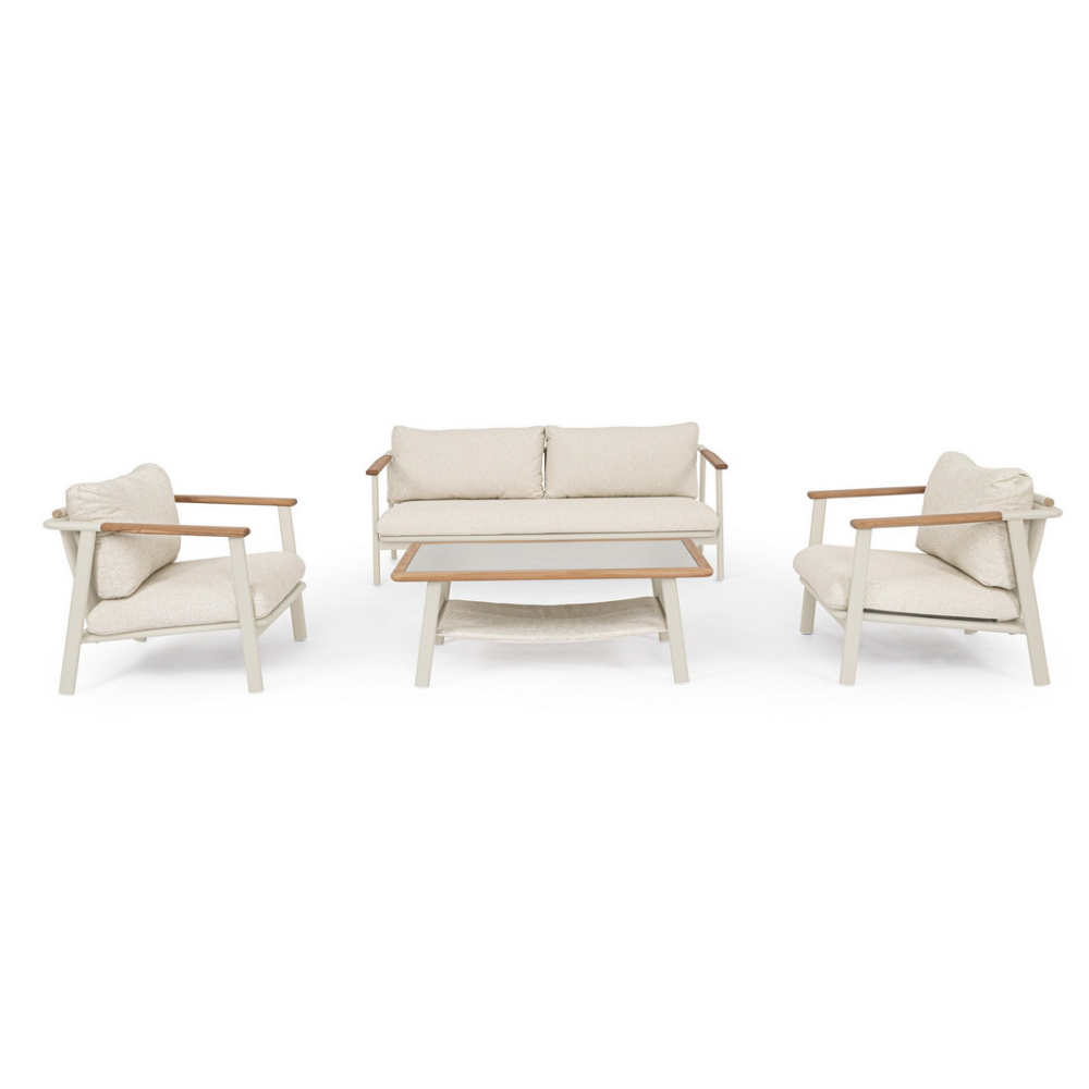 Конструкція з алюмінію із порошковим покриттям (поліестер). Спинка та полиця столика з водовідштовхувальної тканини олефін (100% поліпропілен) з ефектом букле. Підлокітники та спинки із вставками з тикового дерева. Знімні подушки з водовідштовхувальної тканини олефін (100% поліпропілен) з букле ефектом. Кавовий столик (ніжки у зборі) зі скляною стільницею з імітацією натурального каменю.