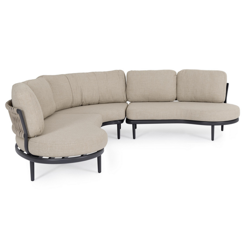 Кутовий диван Bizzotto HELIOS — це універсум комфорту, зібраний з технологічних зірок. Його триєдина модульна конструкція, алюмінієвий каркас, революційні плетені гумові спинки та незнищенні знімні подушки