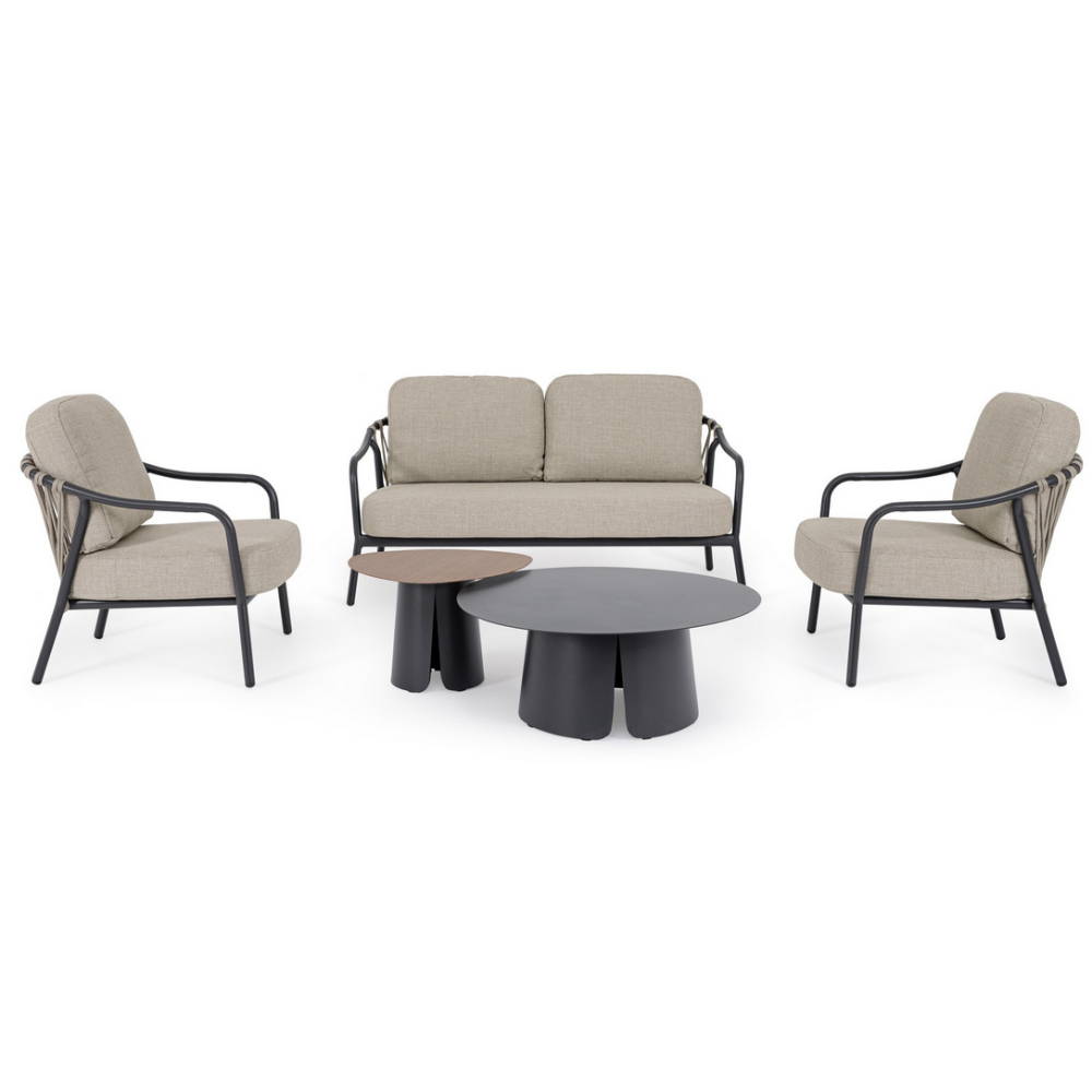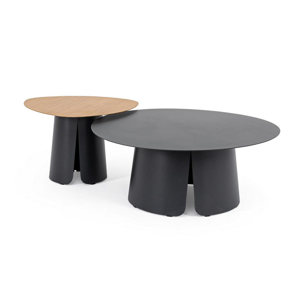 Комплект кавових столів Bizzotto HAYDEN — це філософський трактат у матеріалі. Його дует конусоподібних основ, що несуть архетипове коло та органічну форму гальки, об'єднаних технологією алюмінію та поліестеру,