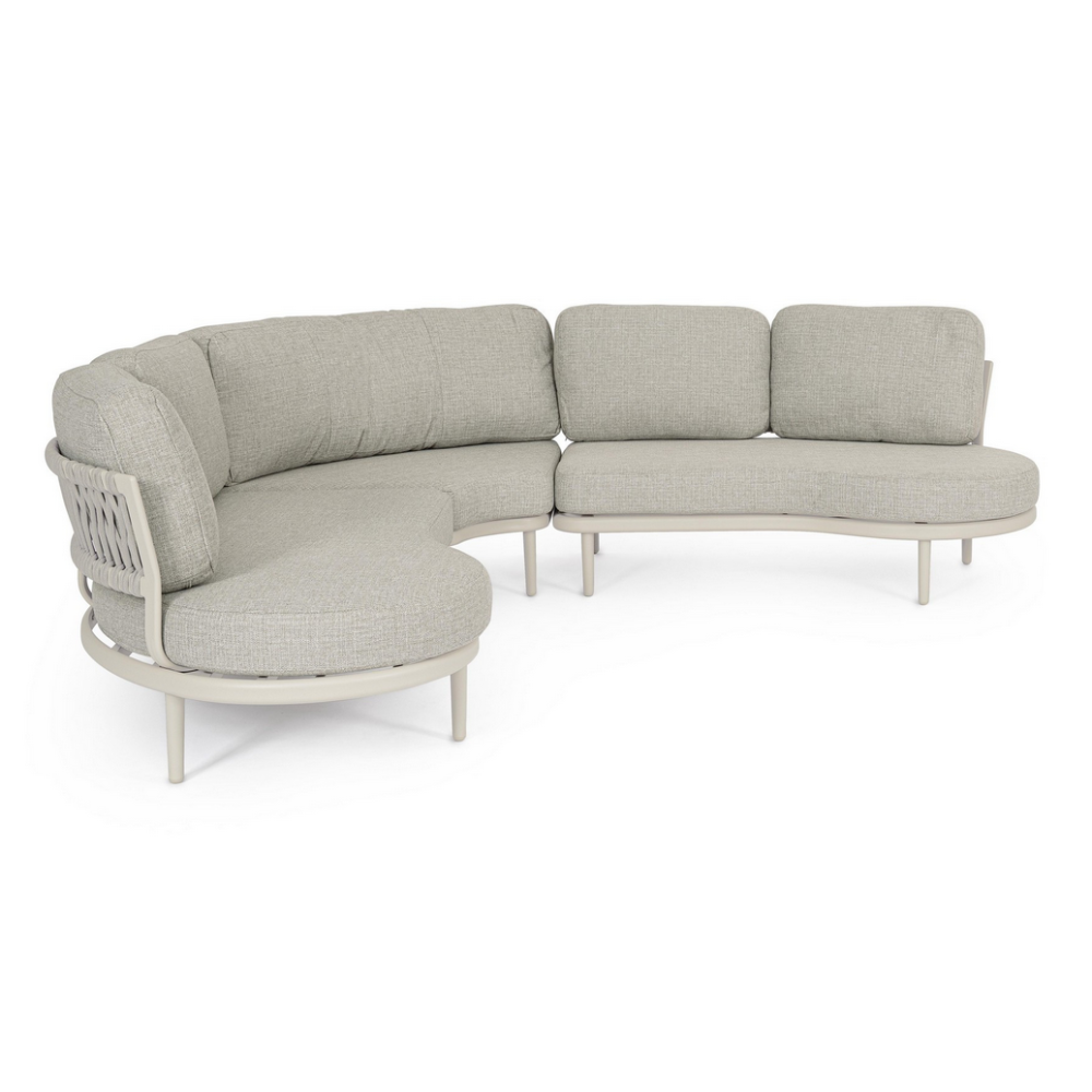 Кутовий диван Bizzotto HELIOS — це універсум комфорту, зібраний з технологічних зірок. Його триєдина модульна конструкція, алюмінієвий каркас, революційні плетені гумові спинки та незнищенні знімні подушки