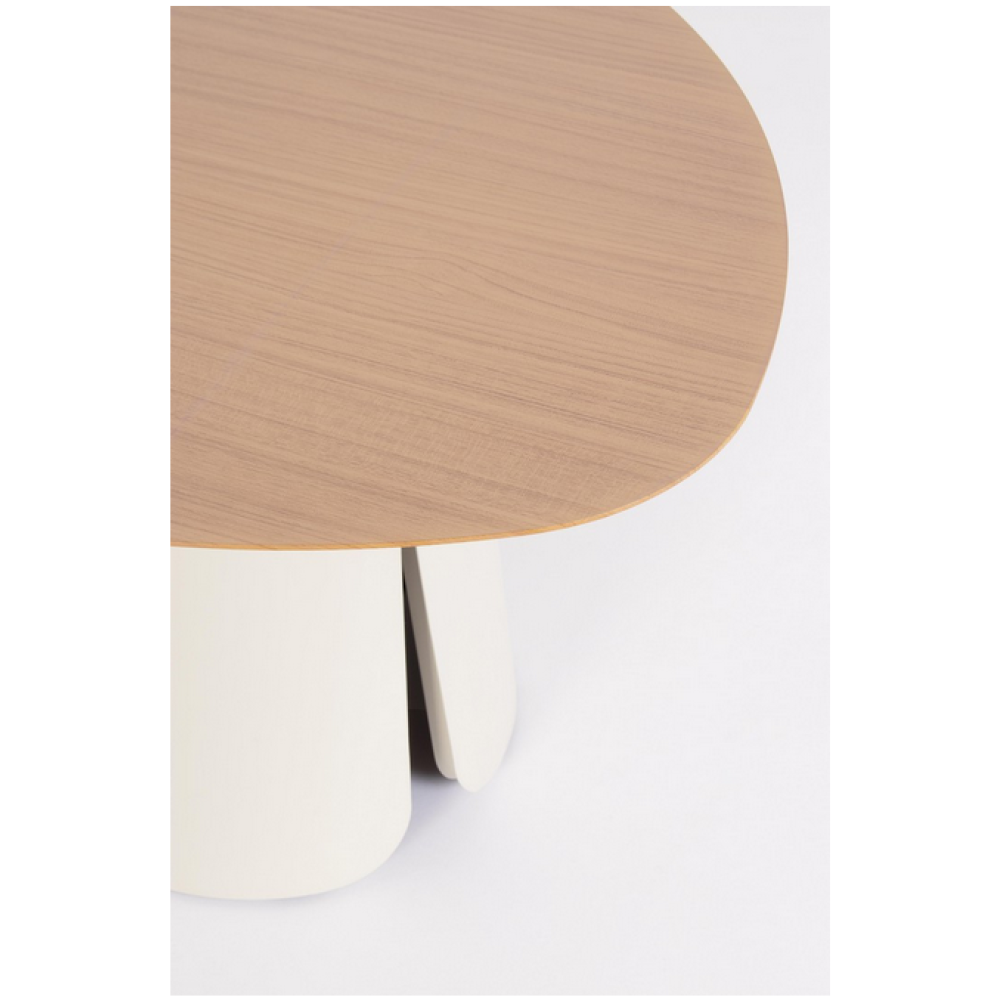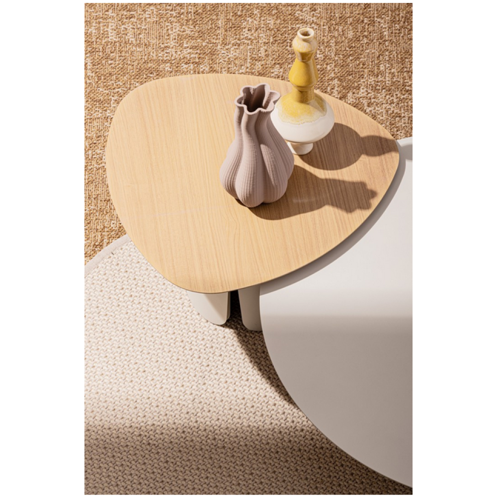 Трикутна стільниця з заокругленнями (менший стіл): Це шедевр дизайнерської думки. Трикутник — форма динамічна, спрямована. Але тут його гострота усунена дуже заокругленими кутами. Це перетворює потенційно агресивну форму на м'яку, обтічну, тактильно безпечну. Асоціація з морською галькою
