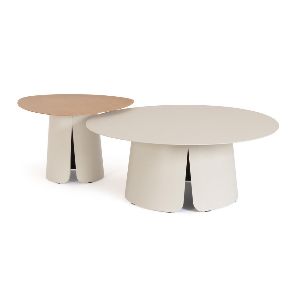 Комплект кавових столів Bizzotto HAYDEN — це філософський трактат у матеріалі. Його дует конусоподібних основ, що несуть архетипове коло та органічну форму гальки, об'єднаних технологією алюмінію та поліестеру,