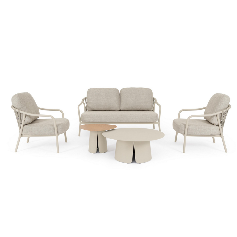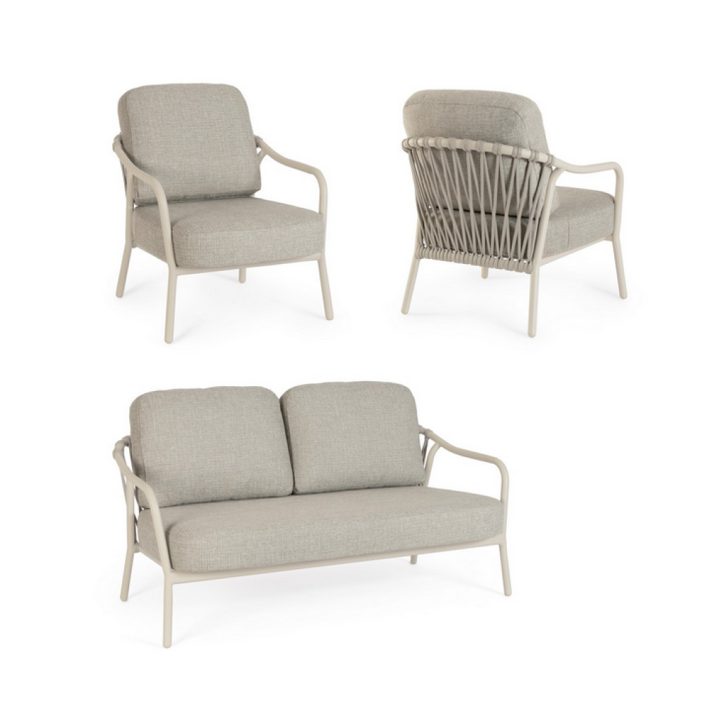 Комплект Bizzotto EDVIGE — це більше, ніж набір м'яких меблів. Це технологічна платформа для комфорту, побудована на триєдиній основі з алюмінію, плетеної гуми та поліпропілену.