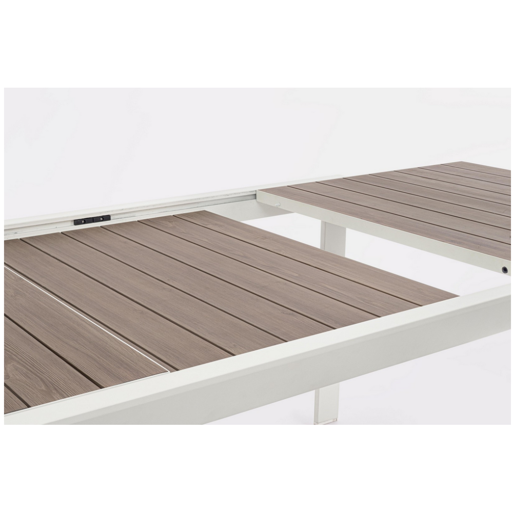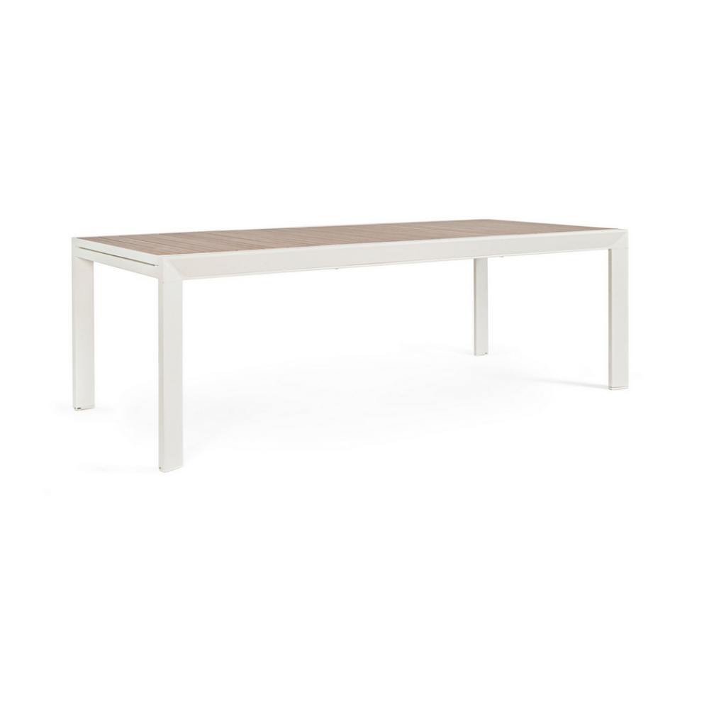 Стільниця столу Bizzotto BELMAR виконана з верхніх планок, оброблених спеціальною покраскою під дерево. Ця інноваційна технологія дозволяє поєднати естетичну привабливість натуральної деревини з виняткової довговічністю та практичністю алюмінію.
