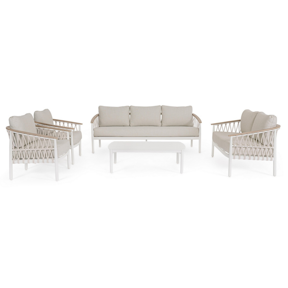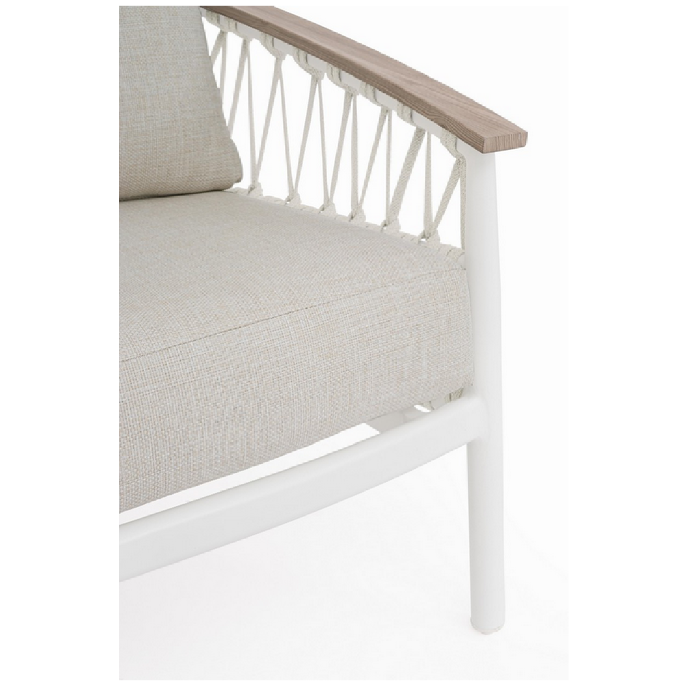 Алюміній із порошковим покриттям (поліестер). Алюмінієві підлокітники з обробкою під дерево та плетінням з олефінової тканини (100% поліпропілен). Зйомні подушки сидіння та спинки з водовідштовхувальною олефіновою тканиною (100% поліпропілен). Регульовані ніжки.
