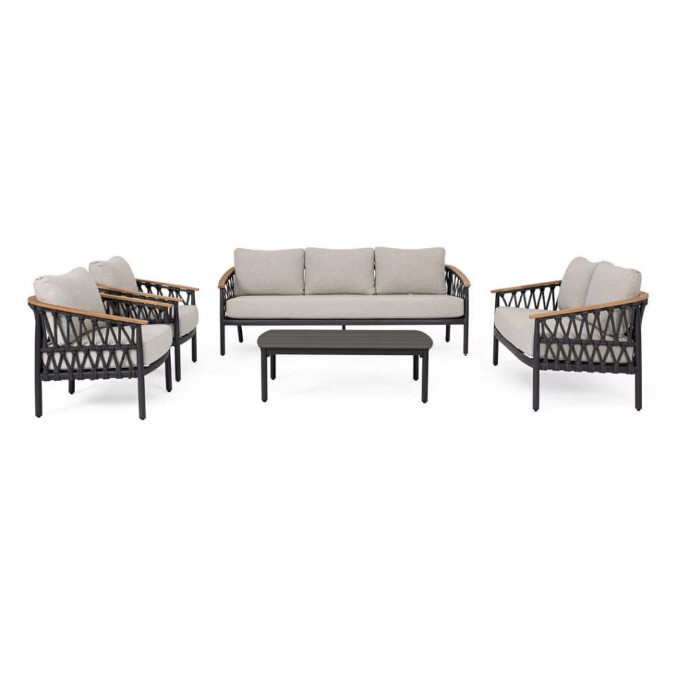 Алюміній із порошковим покриттям (поліестер). Алюмінієві підлокітники з обробкою під дерево та плетінням з олефінової тканини (100% поліпропілен). Зйомні подушки сидіння та спинки з водовідштовхувальною олефіновою тканиною (100% поліпропілен). Регульовані ніжки.