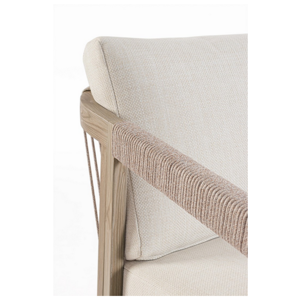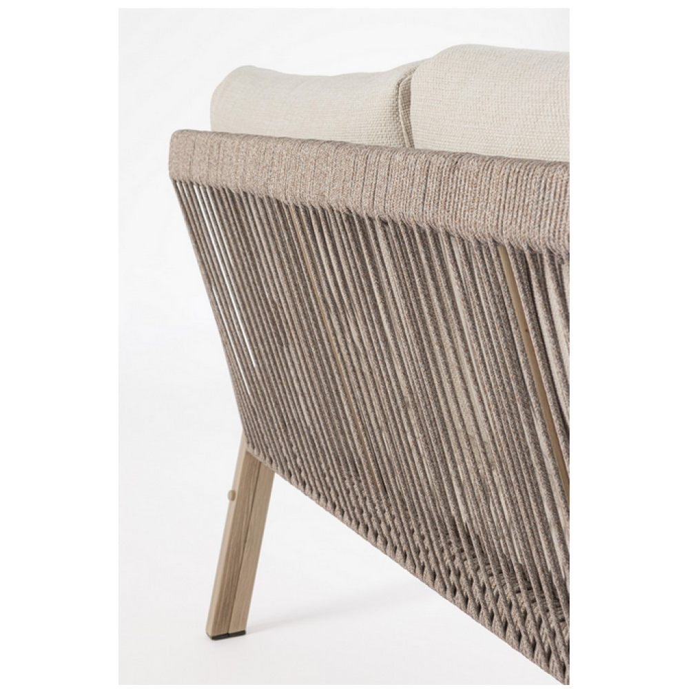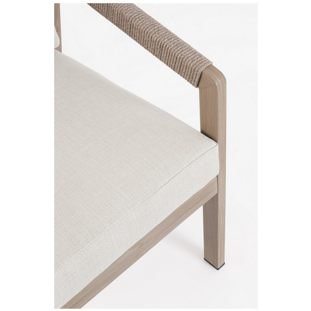 Алюміній із порошковим покриттям (поліестер), що імітує дерево. Стільниця з порцелянової глазурованої плитки (з Іспанії). Спинка та підлокітники з поліестерової мотузки (круглі 5 мм). Знімні подушки сидіння та спинки з водовідштовхувальної тканини олефін (100% поліпропілен). Гвинти із нержавіючої сталі. Потрібно збирання.