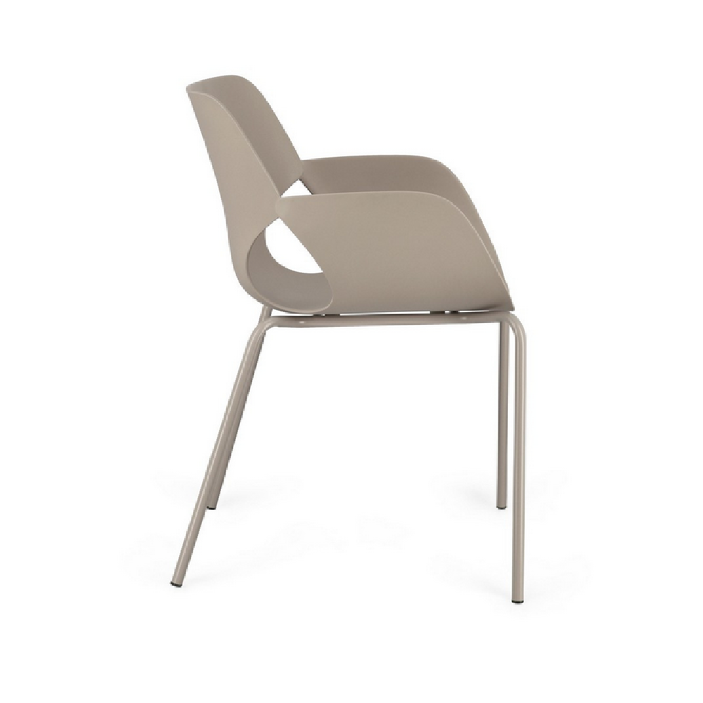 Сидіння виготовлене із пластику (PP). Сталеві ніжки забарвлені епоксидною порошковою фарбою. Ніжки вимагають складання. Штабелюється.
