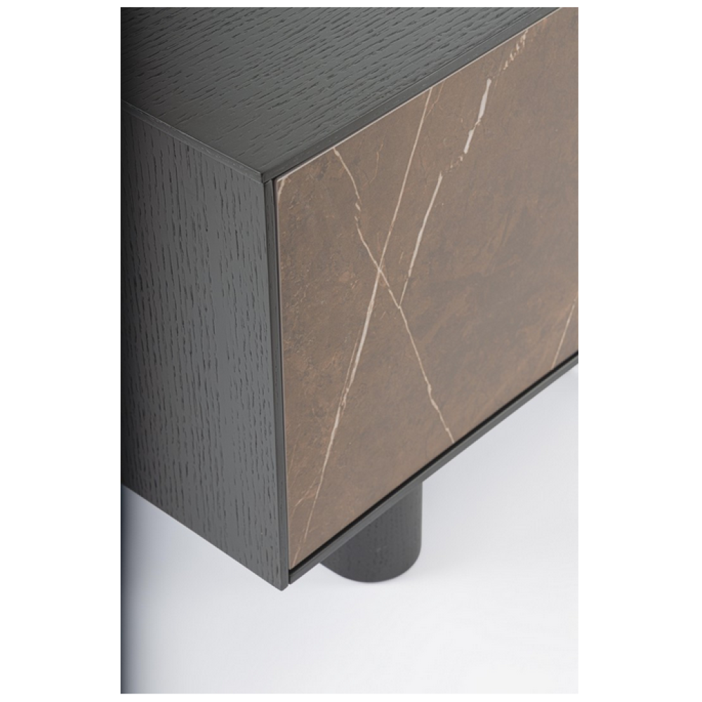 Двері з кераміки є ключовим декоративним та практичним акцентом моделі. Керамічні фасади — продукт високих технологій у меблевій промисловості. Вони володіють абсолютною практичністю: надзвичайною стійкістю до подряпин, високих температур, вологи, кислот та лугів. Гладка, холодна на дотик поверхня кераміки створює витончений сучасний контраст із теплотою дубового шпону. Вона не вимагає спеціального догляду, легко очищається і слугує візуальним центром, що підкреслює інноваційність дизайну. Кераміка також відмінно відбиває світло, що може грати на користь інтер'єрної композиції.