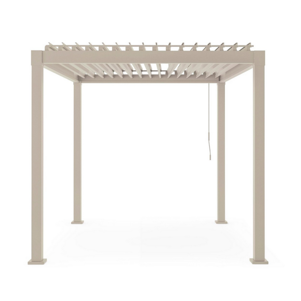 ОЦИНКОВАНА СТАЛЬ З ПОРОШКОВИМ ПОКРИТТЯМ (ПОЛІЕСТЕР). ОПОРНІ СТОРОНИ 80X80 ММ, ПОПЕРЕДНІ БРУСИ 130X50 ММ. ЛАМЕЛЯРНИЙ ДАХ, РЕГУЛЬОВАНИЙ ЗА ДОПОМОГОЮ РУЧНОЇ ВАРАТИ. СОНЦЕЗАХИСНІ ЛОТКИ 173X30,5 ММ. СИСТЕМА ПОТОКУ ВОДИ, ІНТЕГРОВАНА ВСЕРЕДИНІ ОПОРНИХ СТОРОНІВ. ГВИНТИ З НЕРЖАВІЮЧОЇ СТАЛІ. ПОТРЕБУЄТЬСЯ ЗБИРАННЯ.