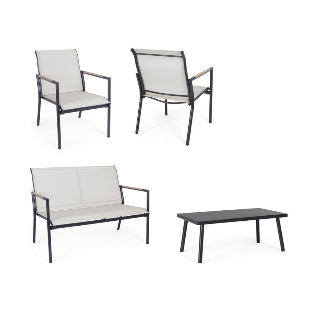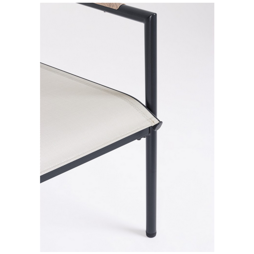 Конструкція із сталі, обробленої для зовнішнього застосування фосфатуванням та порошковою фарбою (поліестер). Сидіння та спинки з текстилену. Підлокітники зі сталі із вставками під дерево, що імітують сталь. Потрібно збирання.