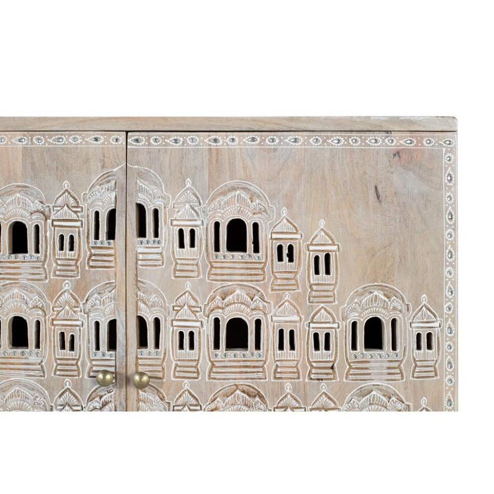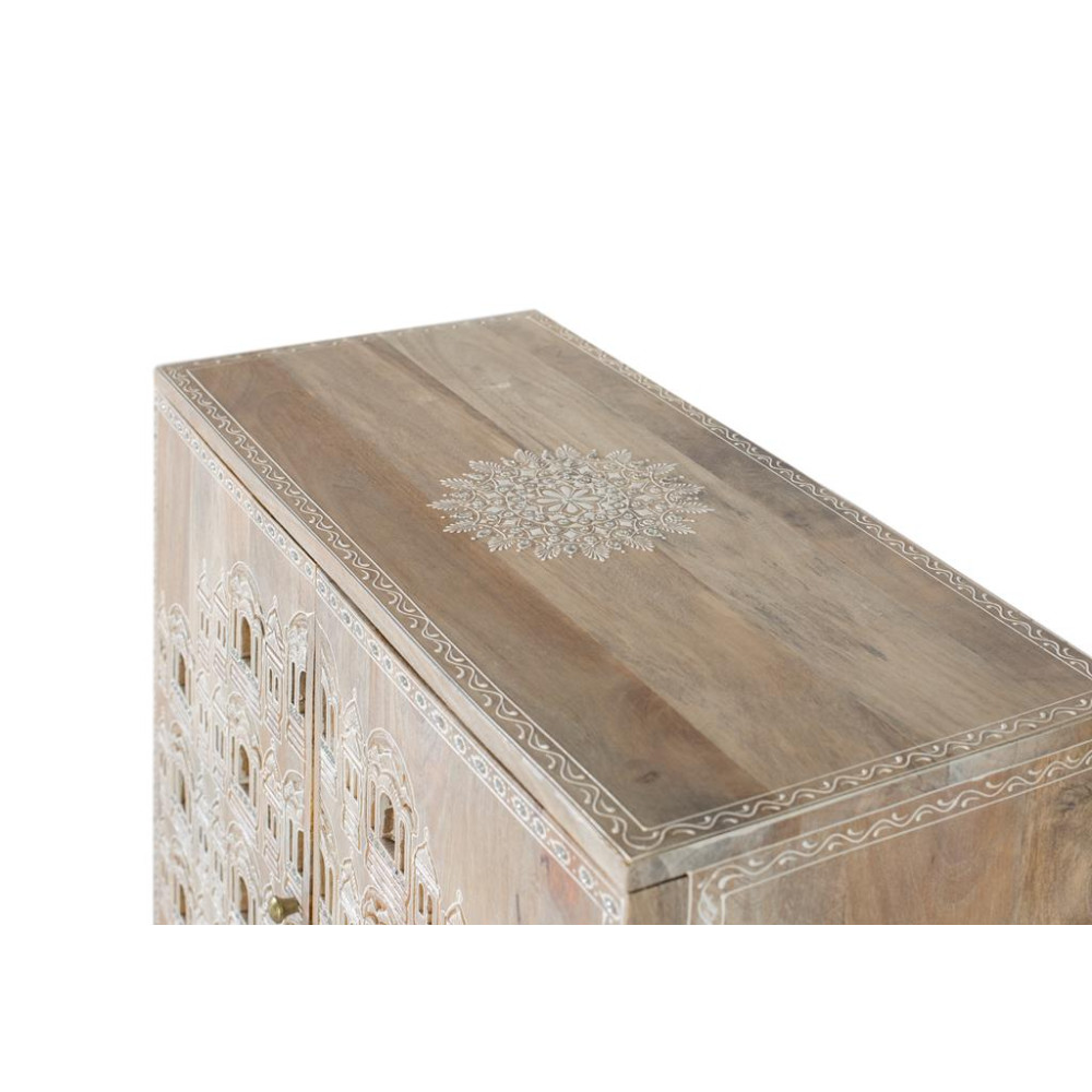 Ця тумба з мангового дерева вирізняється дизайном ручної роботи. Він пофарбований у натуральний тон, який підкреслює унікальну зернистість і колірні варіації деревини. На передній частині двоє дверей мають вражаючі фігури храмів, вирізані вручну, що відображають детальну та ретельну роботу, з формами, натхненними традиційною архітектурою. Відчинивши дверцята, ви побачите полицю всередині, яка забезпечує функціональний простір для організації та зберігання різних речей. РОЗМІР ДВЕРІ - 63х35см