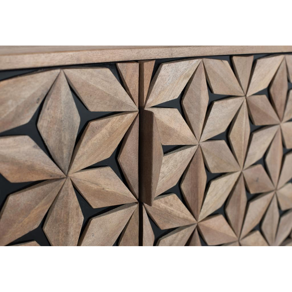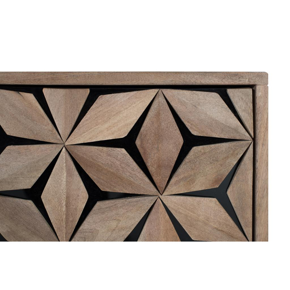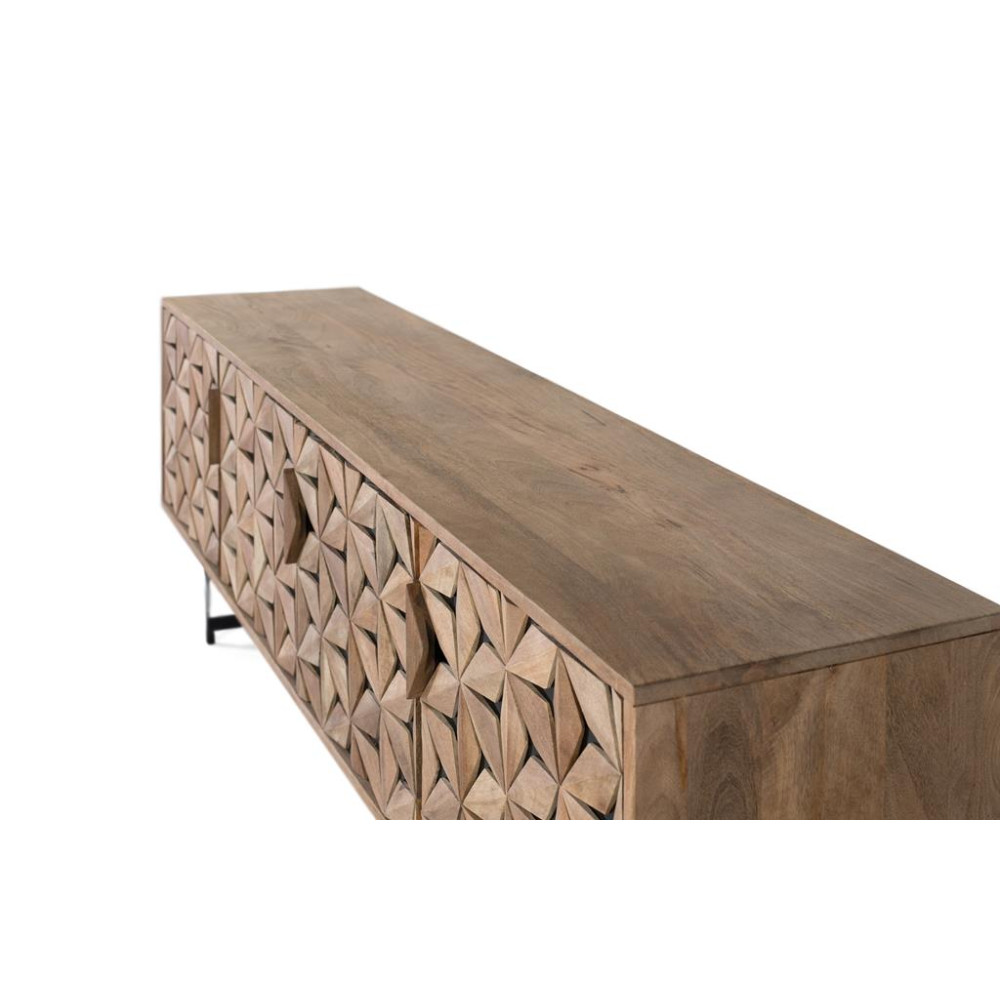 Ця чотиридверна підставка для телевізора виготовлена з дерева манго з натуральним покриттям, яке підкреслює структуру дерева. Його дизайн поєднує в собі функціональність і сучасний стиль, підкреслюючи двері рельєфними геометричними формами. За двома дверцятами є практична полиця для впорядкування предметів, тоді як дві інші дверцята приховують великий відкритий простір. Залізні ніжки з дизайном «Y» пофарбовані в матовий чорний колір, створюючи елегантний контраст із теплом деревини та забезпечуючи стабільність і довговічність пристрою. РОЗМІР ДВЕРЕЙ - 38х43см