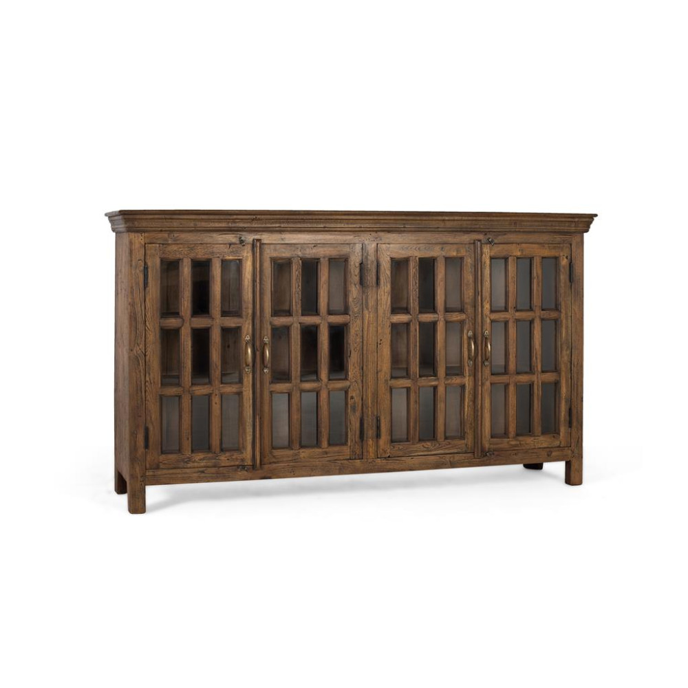 Ця висока тумба виготовлена з відновленого тикового дерева з обробкою лісового горіха, що підкреслює її природний, сільський характер. Його дизайн поєднує в собі елегантність і міцність, вирізняючись міцною і довговічною структурою. Верх покритий великим молдингом, який додає виробу вишуканий штрих. Шафа має чотири дверцята, кожна з яких обрамляє скляну панель, що дозволяє оглядати внутрішній простір. Всередині три міцні полиці забезпечують достатньо місця для зберігання, зберігаючи при цьому таку ж міцність, як і решта шафи. Як останній штрих, дверні ручки старовинного золота створюють тонкий контраст, підкреслюючи класичний і вишуканий стиль. РОЗМІР ДВЕРІ - 81х41см
