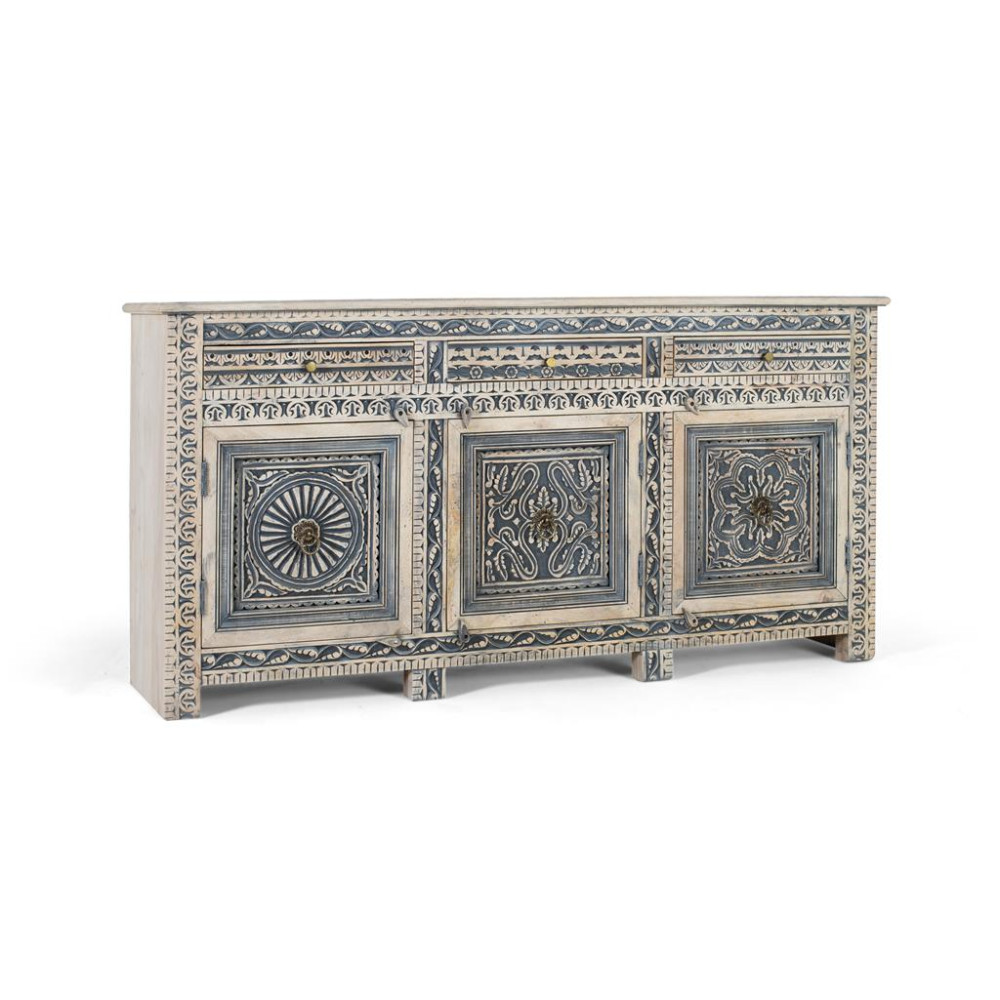 Ця тумба, виготовлена з міцного мангового дерева, вирізняється своєю елегантною білою обробкою. Його дизайн поєднує в собі функціональність і артистизм. У верхній частині шафи є три просторі висувні ящики, вирівняні горизонтально, а потім три дверцята знизу, які забезпечують достатньо місця для зберігання. Різьблення ручної роботи підсилюється темно-синім фоном, який контрастує з побілкою решти шафи, завдяки чому рельєфи стають живими та візуально виділяються. РОЗМІР ЛИЦЯ: 10х50см
