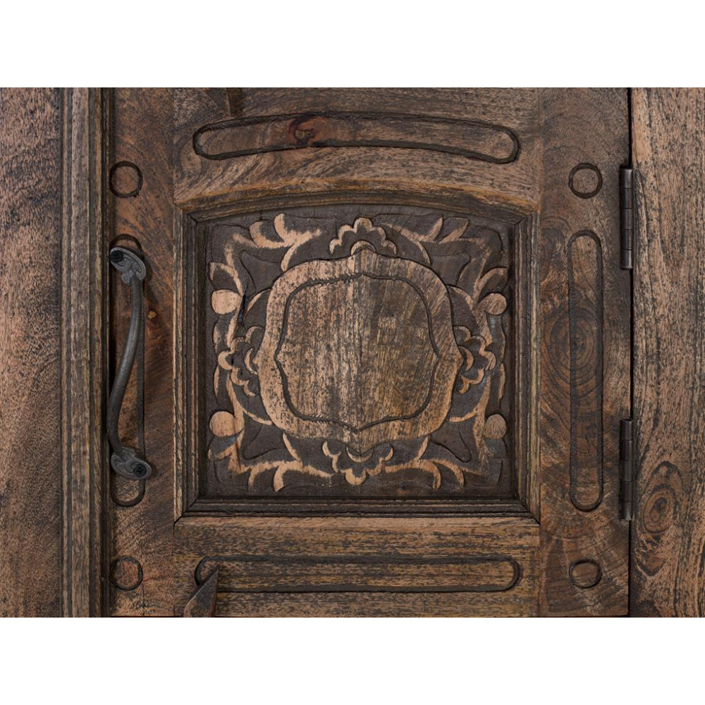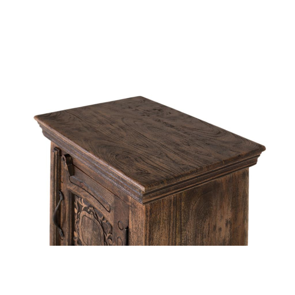 Тумбочка з масиву мангового дерева з обробкою в рустикальному стилі, яка підкреслює натуральну зернистість і характер ручної роботи матеріалу. Він має вхідні двері, прикрашені квітковим різьбленням по центру та кованою фурнітурою. Завдяки компактному дизайну він ідеально підходить як тумбочка, столик у вітальні або декоративний елемент у сільському, колоніальному чи етнічному стилі. Міцний, функціональний та яскраво виражений. РОЗМІР ДВЕРЕЙ: 36х36см