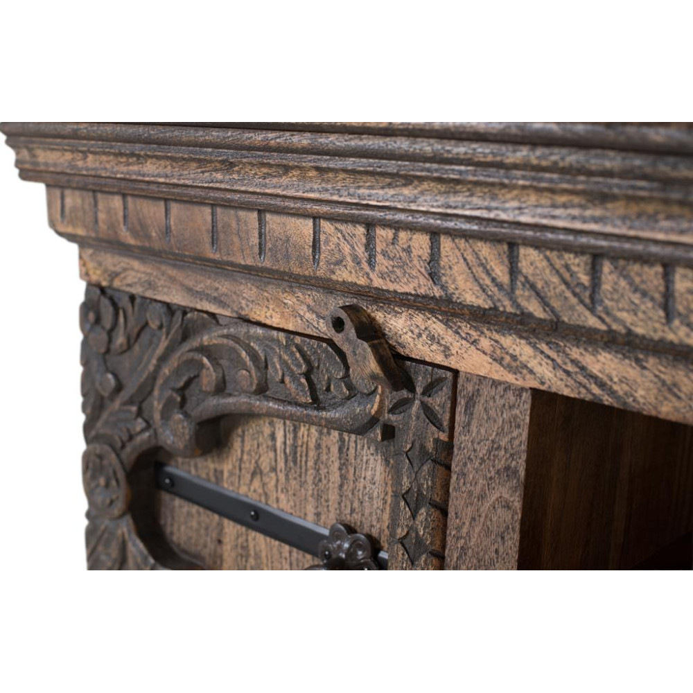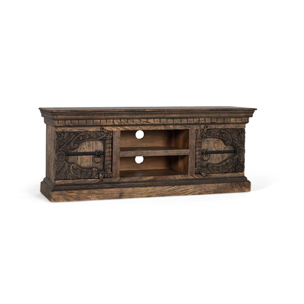 Тумба під телевізор з масиву мангового дерева з антикварною обробкою. Він має двоє бічних дверей ручного різьблення з орнаментальними мотивами та фурнітурою з кованого заліза, що додає індивідуальності та ремісничого стилю. Він має відкритий центральний простір із двома полицями, що ідеально підходить для електронного обладнання чи декоративного зберігання. Його міцна конструкція та надійний дизайн роблять його функціональним і декоративним предметом. РОЗМІР ДВЕРЕЙ: 32х39см