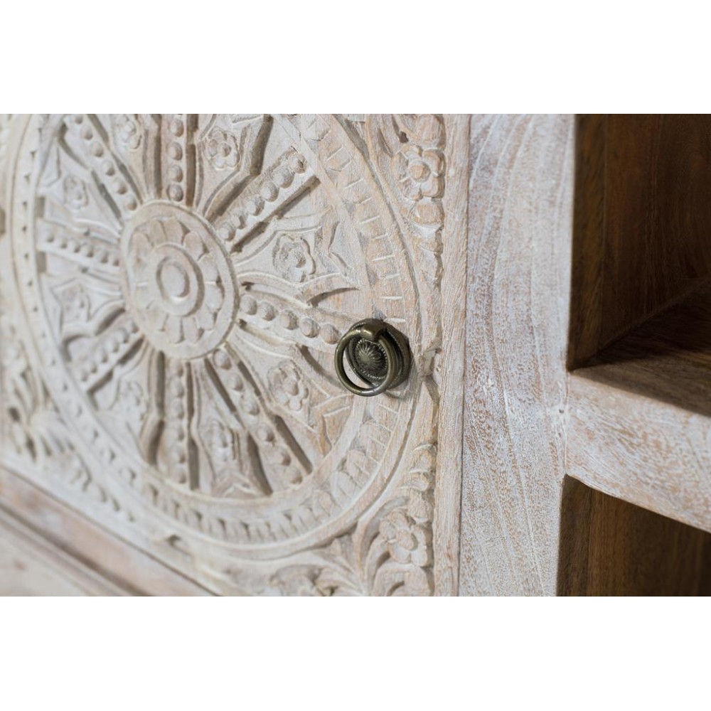 Ця підставка для телевізора поєднує в собі елегантність і функціональність, виготовлена з твердої деревини манго з покриттям пісочного кольору. Його дизайн включає центральну нішу з двома полицями, що ідеально підходить для електронних пристроїв, і дві бічні дверцята, прикрашені геометричними фігурами, вирізаними вручну. Молдинг у верхній частині та плінтус у нижній частині доповнюють класичну естетику. Цей предмет не тільки забезпечує функціональність, але й додає унікальний декоративний елемент будь-якій вітальні. РОЗМІР ДВЕРЕЙ - 39х39см