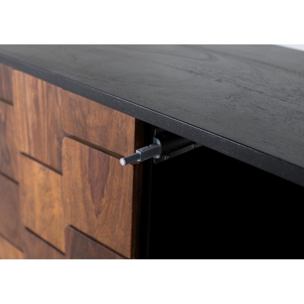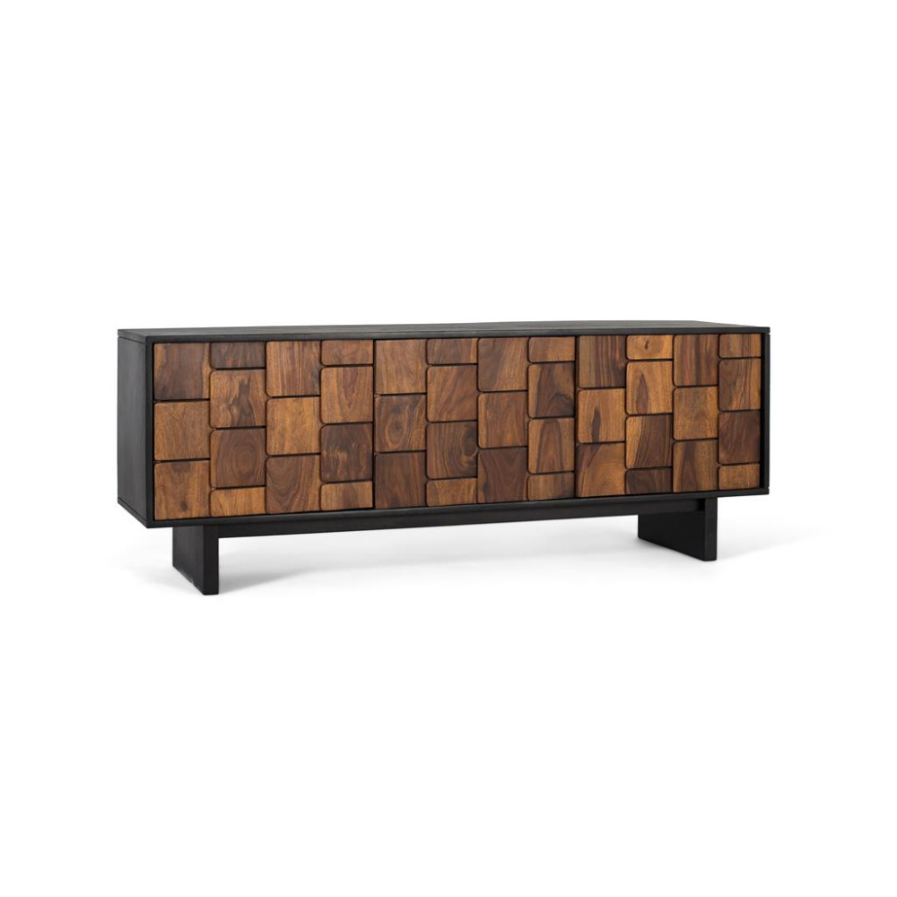 У цій тумбі під телевізор поєднуються природна елегантність і сучасний характер. Виготовлений із міцного мангового дерева, його структура має покриття кольору венге. Три дверцята, що відчиняються, виготовлені з деревини шишам теплого горіхового відтінку, мають оригінальний дизайн, що складається з квадратних частин, що накладаються один на одного, що створює ефект об’єму та глибини. Усередині великий простір пропонує достатню кількість речей. Блок спирається на основу з простими лініями, що забезпечує стійкість і візуальну легкість конструкції. РОЗМІР ДВЕРЕЙ - 40х52см