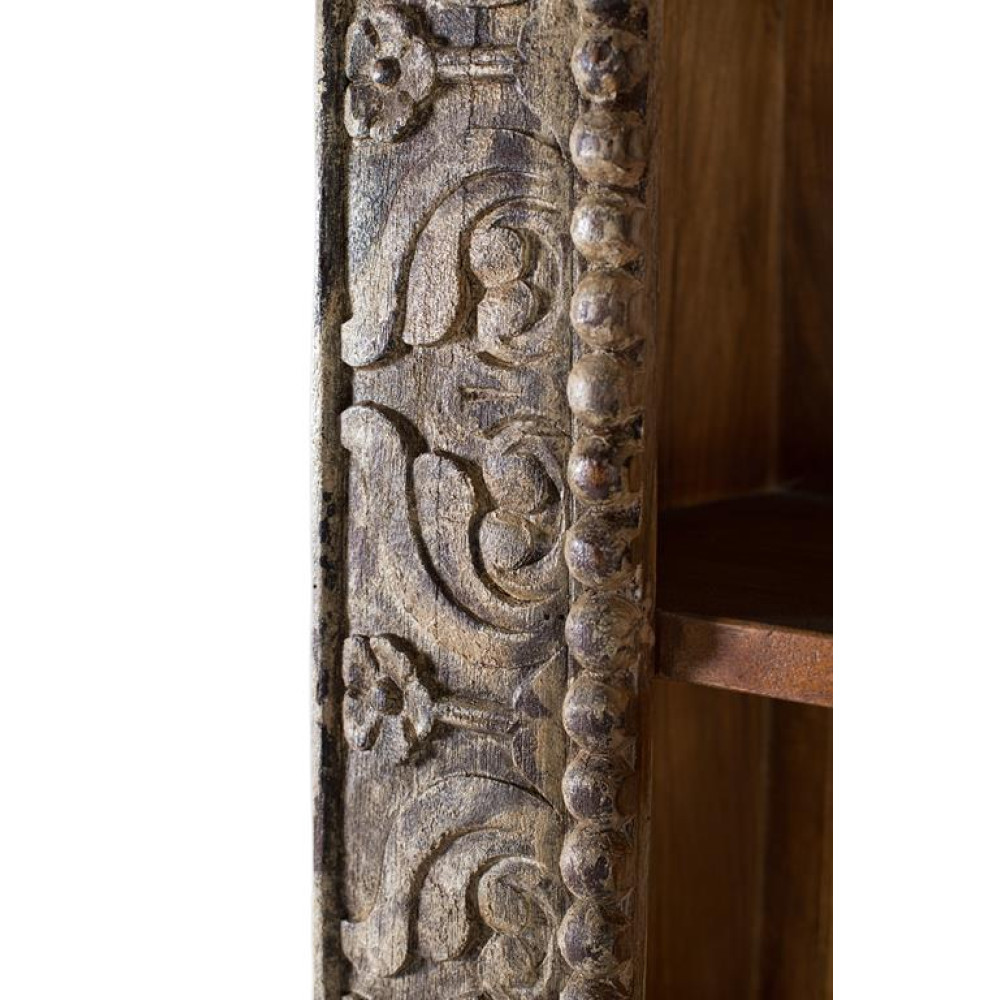 Книжкова шафа з мангового дерева з постарілою обробкою та ручним різьбленням спереду. Його дизайн поєднує в собі прямі лінії з вишуканою квітковою рамою та рельєфними деталями, які додають характеру ручної роботи та екзотичного відчуття. Він має чотири просторі полиці, на яких достатньо місця для зберігання книг, прикрас або особистих речей. Цей виріб ідеально підходить для приміщень, які шукають тепла, елегантності та етнічної нотки, виділяється красою дерева та багатством різьблених робіт. ВИСОТА ПОЛИЦІ - 37 СМ
