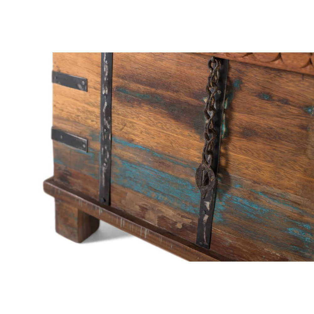 Ця скриня виготовлена з переробленої деревини з отвором у верхній частині та оздобленням, які зберігають оригінальний характер матеріалу, включаючи зернистість, сліди та сліди фарби синіх і коричневих тонів. Його міцну естетику доповнюють зістарені металеві елементи посилення та деталі на кришці та боках, які додають індустріального та автентичного відчуття. Кожен стовбур є унікальним завдяки використанню відновленої деревини, що робить його екологічним виробом із великою індивідуальністю. ВНУТРІШНІЙ ПРОСТОР - 34х62х29см
