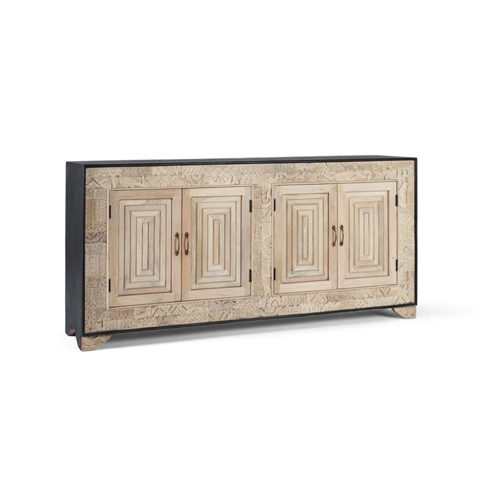 Тумба з масиву мангового дерева вирізняється дизайном, який вирізняється ручним різьбленням і елегантним поєднанням природних тонів із структурою в темній рамці. Передня частина має чотири двері з різьбленими вручну геометричними панелями. Кожна пара дверей приховує простір з внутрішніми полицями. Металеві бронзові ручки під старовину доповнюють сільсько-елегантну естетику набору. ВИСОТА НІЖКИ - 7 СМ