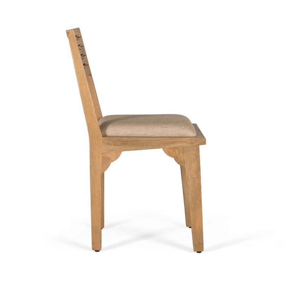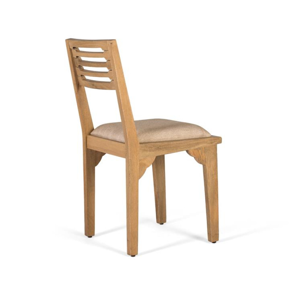 Набір із двох стільців із масиву дерева манго з натуральним покриттям, яке підкреслює його текстуру та теплий тон. Спинка має горизонтальну планку з декоративними вирізами, що додає легкості ручної роботи. Сидіння м’яке та оббите тканиною нейтрального бежевого кольору, що забезпечує комфорт і легкість поєднання з різними стилями їдальні чи кухні. Завдяки простим, міцним лініям ці стільці ідеально підходять для сільського, скандинавського чи сучасного інтер’єру, де потрібна функціональність без шкоди для естетики. СПИНКА - 43х38см