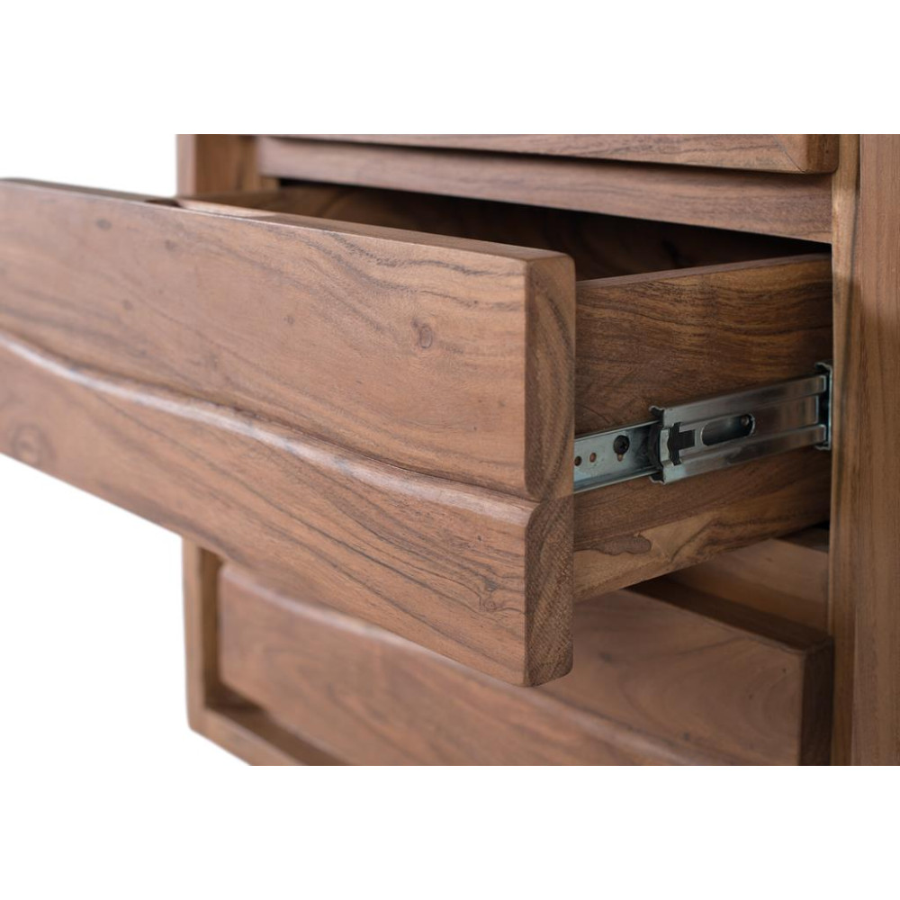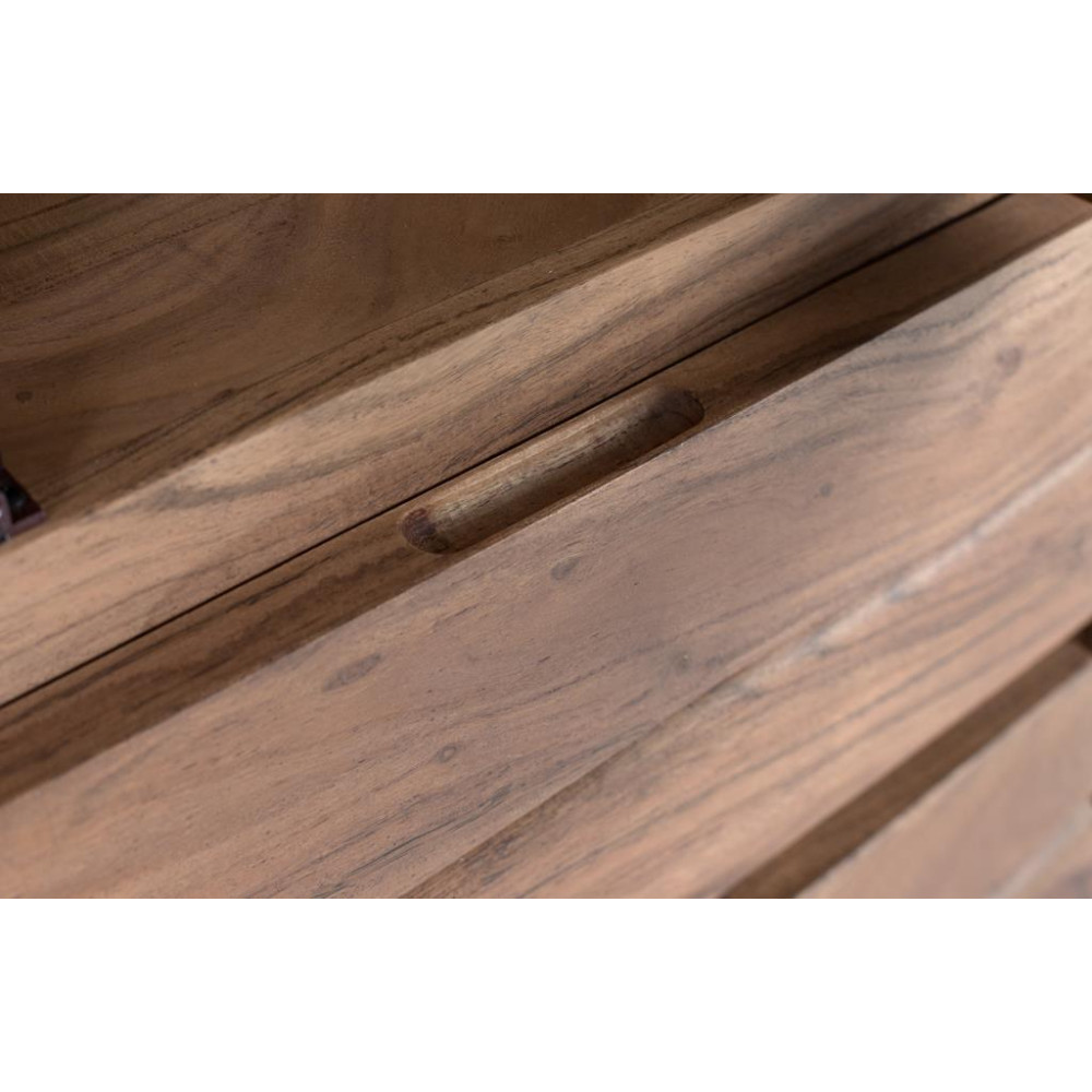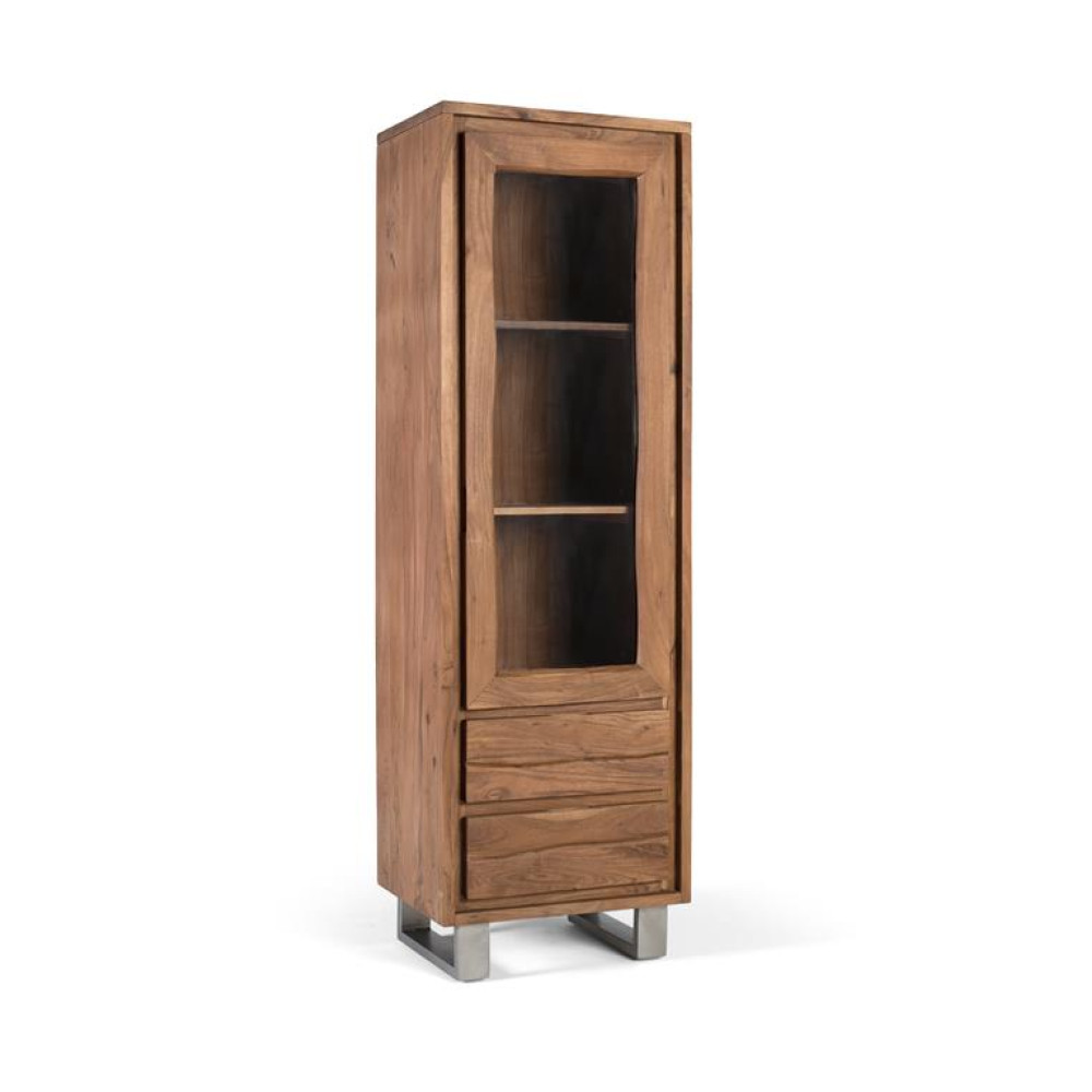 Шафа-вітрина з масиву акації з чистим і сучасним дизайном. Він має скляні двері з дерев’яною рамою, а внутрішній простір поділено на дві полиці для зберігання або демонстрації. Нижня секція містить два великих ящика без видимих ручок. Шафа тримається на прямих металевих ніжках, створюючи тонкий сучасний контраст із теплою природною обробкою дерева. Ідеально підходить як допоміжна вітрина у вітальнях, їдальнях або офісах. ПЕРЕДНИЙ ЯЩИК - 18х49см
