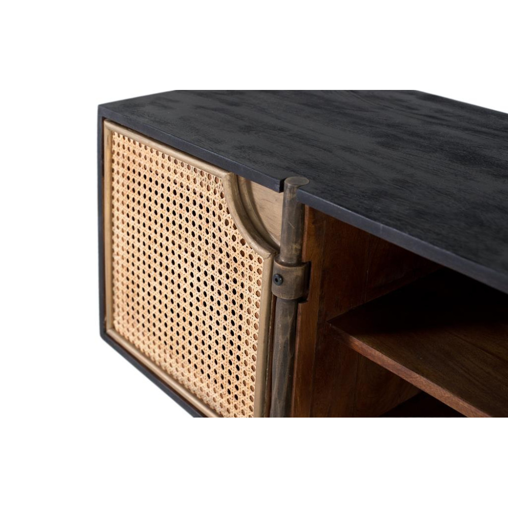 Ця тумба під телевізор виготовлена з дерева манго. Він вирізняється сучасним дизайном з елементами ретро, який характеризується сітчастими дверцятами у світлих тонах у стилі каннаж. Основа і ніжки виготовлені із заліза з бронзовою обробкою. У центрі блоку знаходяться дві відкриті полиці, ідеальні для електронного обладнання. Дизайн ідеально поєднує естетику та функціональність. РОЗМІР ДВЕРЕЙ - 35х35см