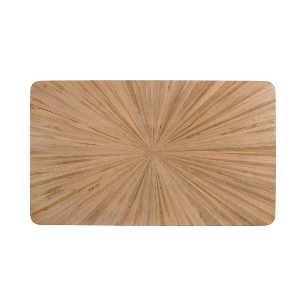 Цей обідній стіл поєднує в собі елегантність, функціональність і довговічність завдяки ретельному виготовленню з переробленого тикового дерева та пофарбованим у чорний колір залізним ніжкам. Прямокутна стільниця має дизайн ручної роботи з вражаючим радіальним візерунком, що виходить із центру, підкреслюючи природну зернистість і відтінки, типові для тикового дерева. Заокруглені кути стільниці створюють відчуття візуальної легкості та безпеки, а тонкі металеві ніжки під кутом створюють міцну та стабільну основу. ВИСОТА НІГИ - 74 СМ