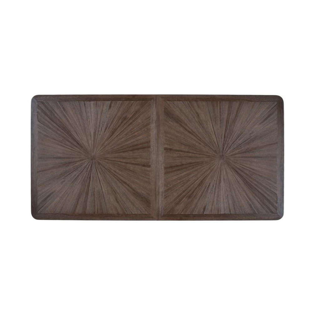 Обідній стіл має прямокутну стільницю з переробленого тикового дерева. Стільниця має продуманий візерунок маркетрі з радіально-квадрантним дизайном, що створює симетричний візуальний ефект. Основа складається з набору перехрещених залізних ніжок у формі «X», пофарбованих у матовий чорний колір. Завдяки своїй міцній конструкції цей стіл ідеально підходить для великих їдалень або відкритих просторів, які прагнуть поєднати функціональність із сучасною естетикою. ВИСОТА НІГИ - 74 СМ TOP - 3 CM Перероблене тикове дерево та метал