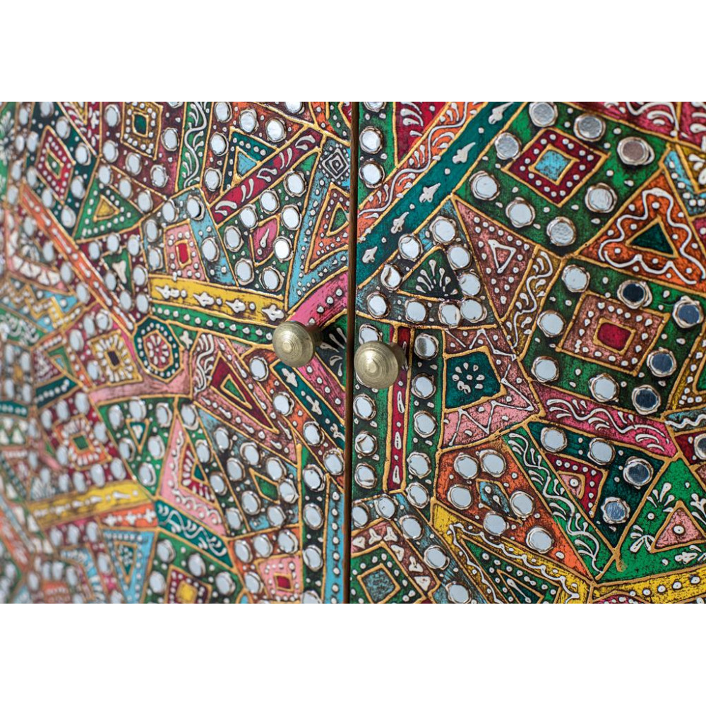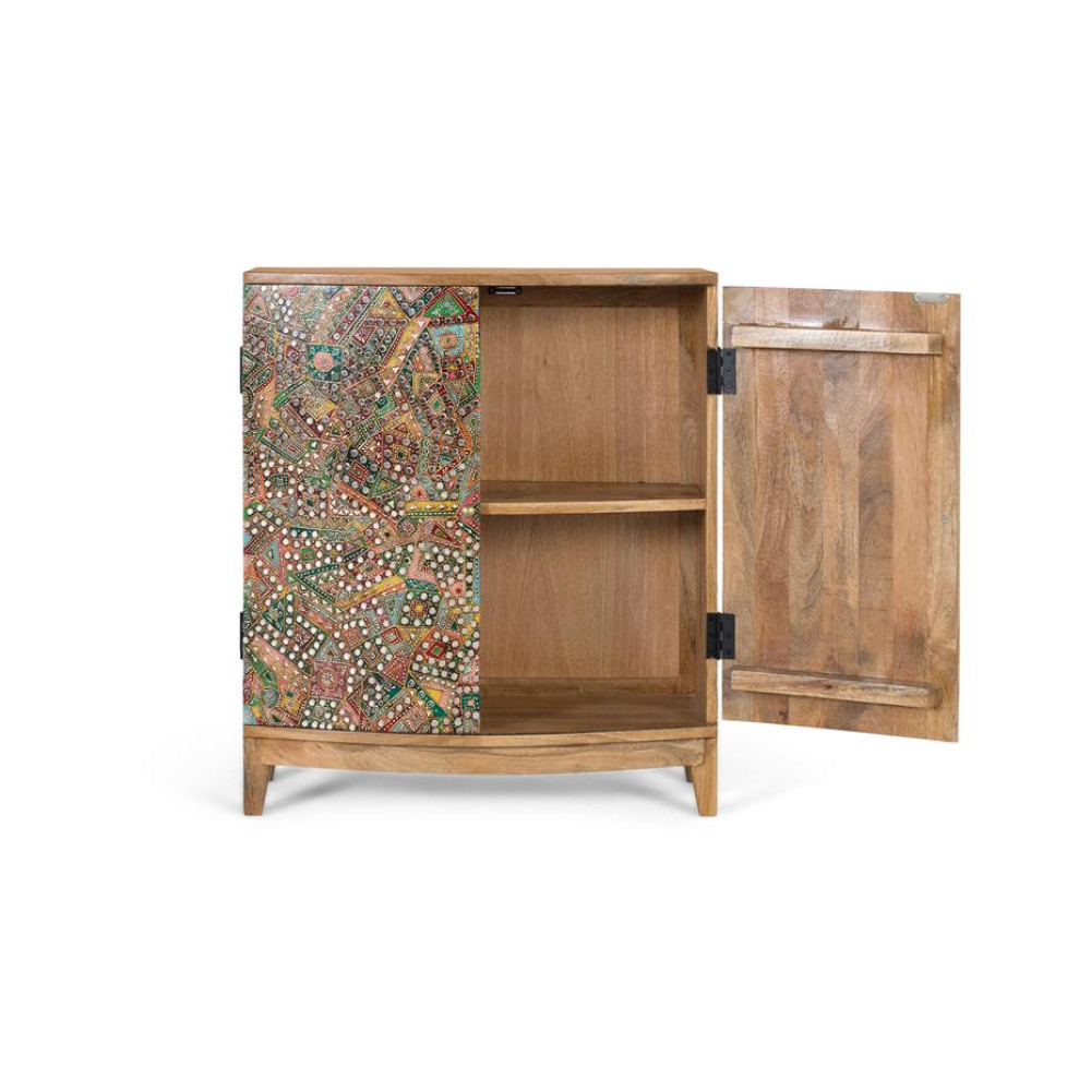 Ця дерев'яна тумба вирізняється своїм художнім і барвистим дизайном. Він має компактну конструкцію з двома плавно вигнутими передніми дверцятами та внутрішньою полицею. Передня частина багато прикрашена мозаїкою з геометричних і квіткових візерунків яскравих відтінків, з маленькими дзеркалами та металевими деталями, які додають блиску та текстури. Стільниця і ніжки виготовлені з натурального дерева. РОЗМІР ДВЕРЕЙ: 61х34см