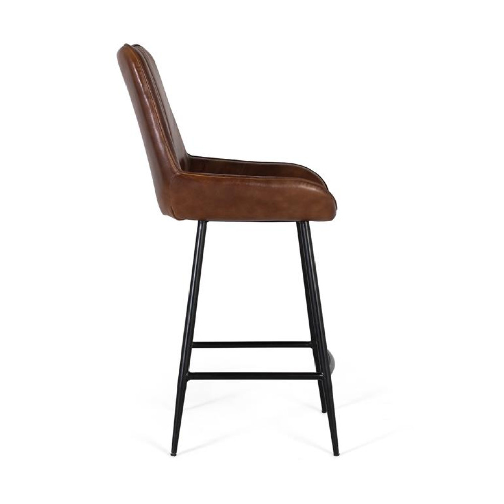 Високий табурет із сидінням і спинкою, оббитими коричневою шкірою, декоративними вертикальними швами та набивкою для комфорту. Його ергономічний дизайн забезпечує хорошу поперекову підтримку, що ідеально підходить для тривалого використання в барах або на кухонних островах. Пофарбована в матовий чорний залізна рама забезпечує стабільність, довговічність і сучасний контраст із теплою обробкою сидіння. Ідеально підходить для індустріального, сучасного або вінтажного стилю. ВИСОТА НІЖКИ - 62 СМ