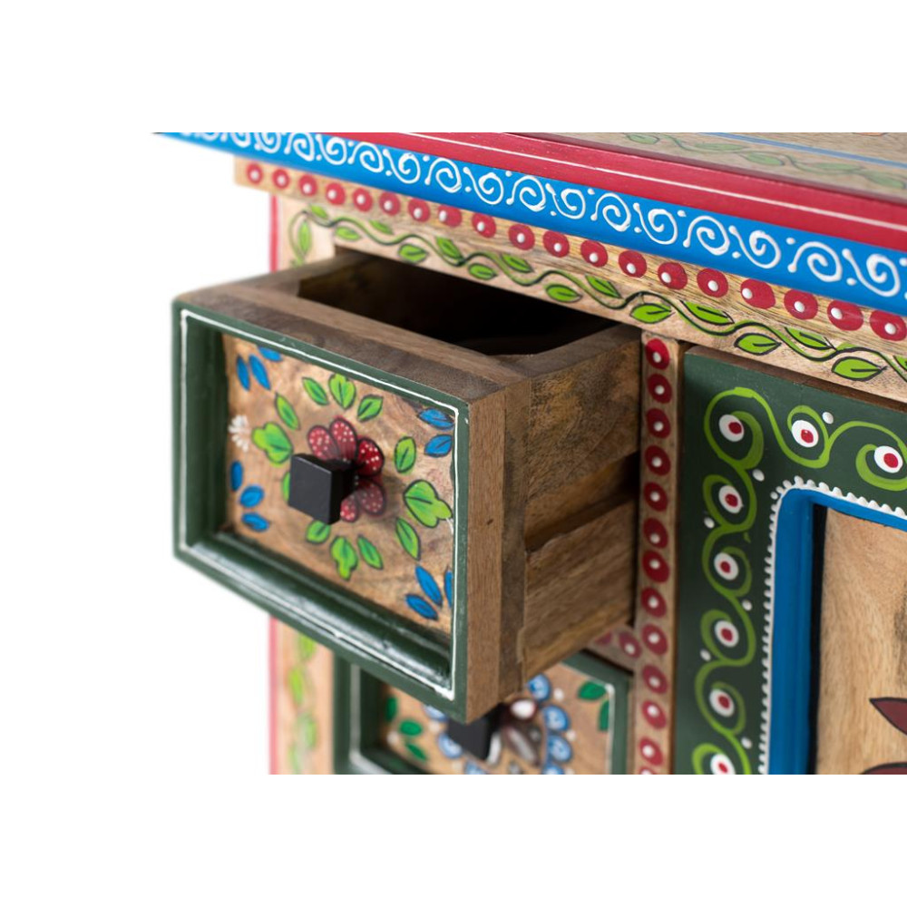 Цей предмет меблів, виготовлений із дерева манго, поєднує тепло натуральних матеріалів із шармом майстерності. Його натуральна обробка та яскраві квіткові мотиви надають йому унікального та яскравого характеру. Цей виріб має чотири невеликі ящики та дверцята з додатковим відділенням для зберігання. Його дизайн завершується плінтусом у нижній частині, що забезпечує стабільність і елегантний вигляд. РОЗМІР ЛИЦЯ: 12х15см